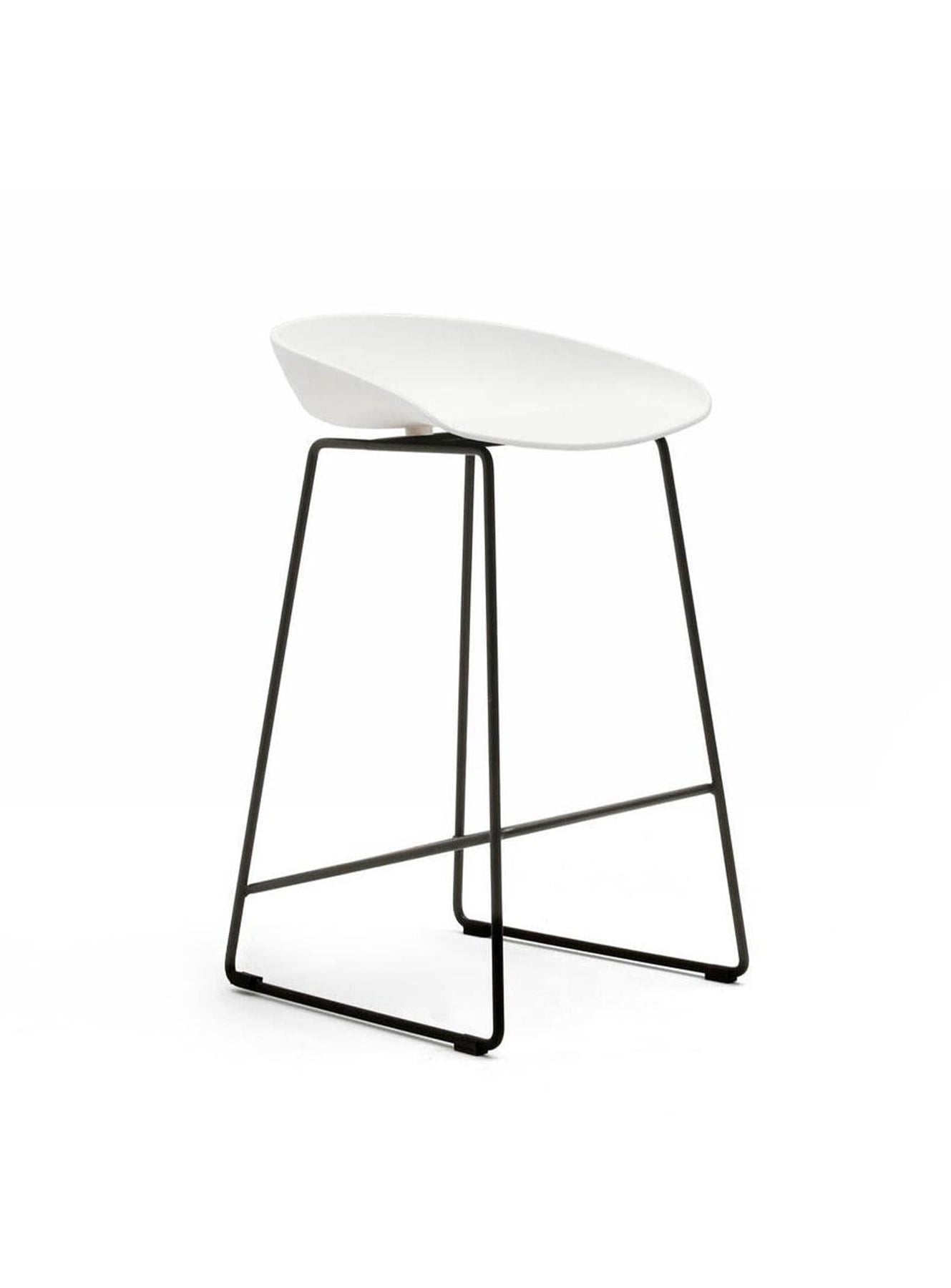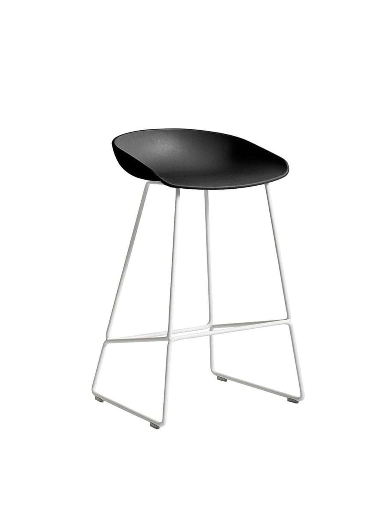 Tabouret About 38 : base en métal, assise moulée et design épuré. noir et blanc