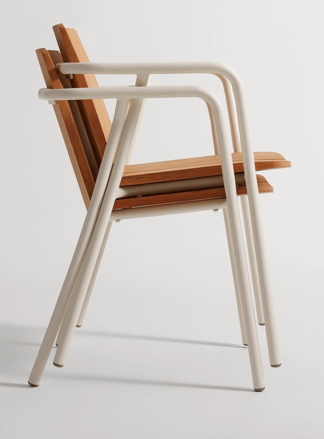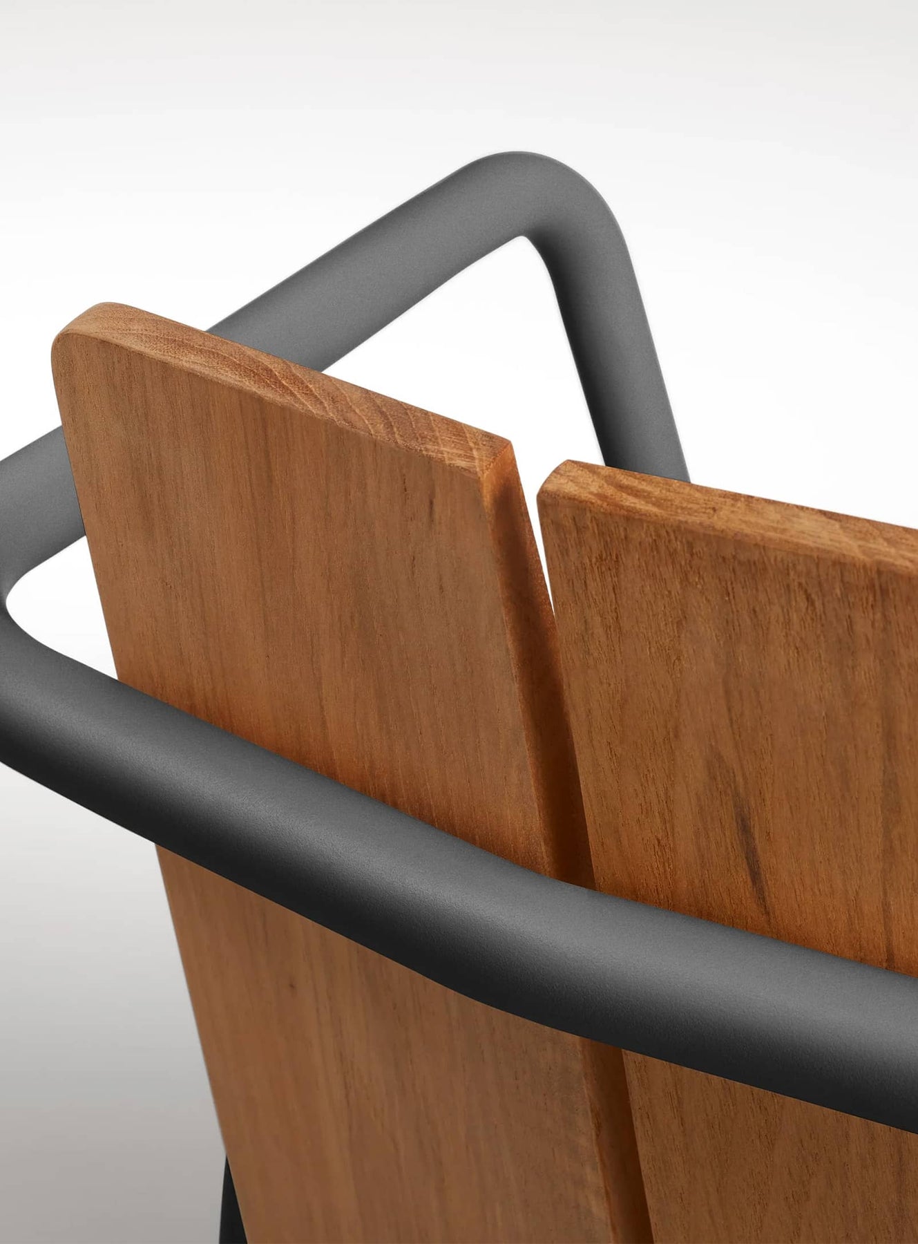 L'assise et le dossier de la chaise Offline sont composés de planches effilées en teck massif certifié FSC®, dont les bords soigneusement biseautés adoucissent le contact et épousent naturellement la silhouette. Ce soin apporté à la matière ne relève pas du détail : c'est lui qui transforme une simple chaise en une expérience d'assise agréable et durable. La beauté naturelle du teck — ses veines, sa chaleur, ses nuances — fait le reste.