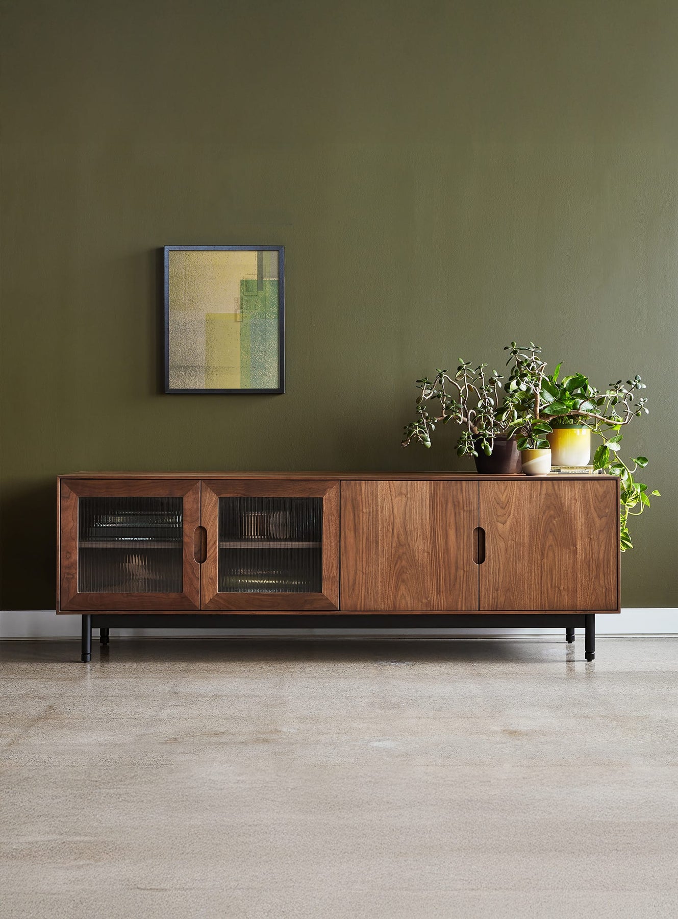 Buffet Munro Gus* Modern, style minimaliste et portes en verre cannelé mystérieuses. noyer