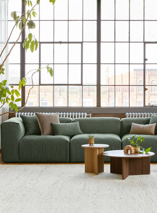 Sofa trois places modulable Nest de Gus* Modern dans un salon moderne. morris pine.