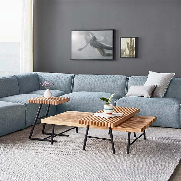 La table à café Transit de Gus* Modern, avec son profil bas et large, évoque une ambiance décontractée et terre-à-terre qui lui permet de s'intégrer harmonieusement dans tout espace minimaliste. La surface, qui crée un motif élémentaire agréable, est construite avec des pièces de bois massif qui sont assemblées précisément en parallèle pour créer un design à la fois robuste et léger. Les pieds sont légèrement évasés pour plus de stabilité et sont fabriqués en acier revêtu de poudre.
