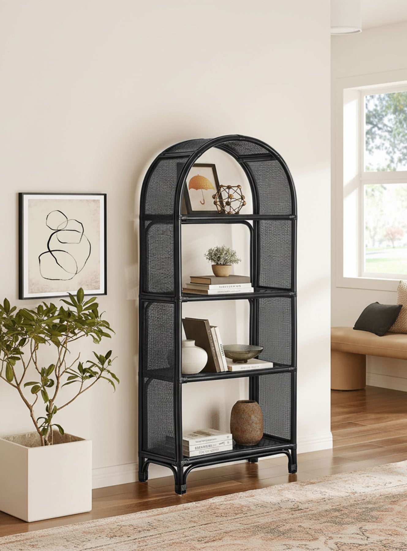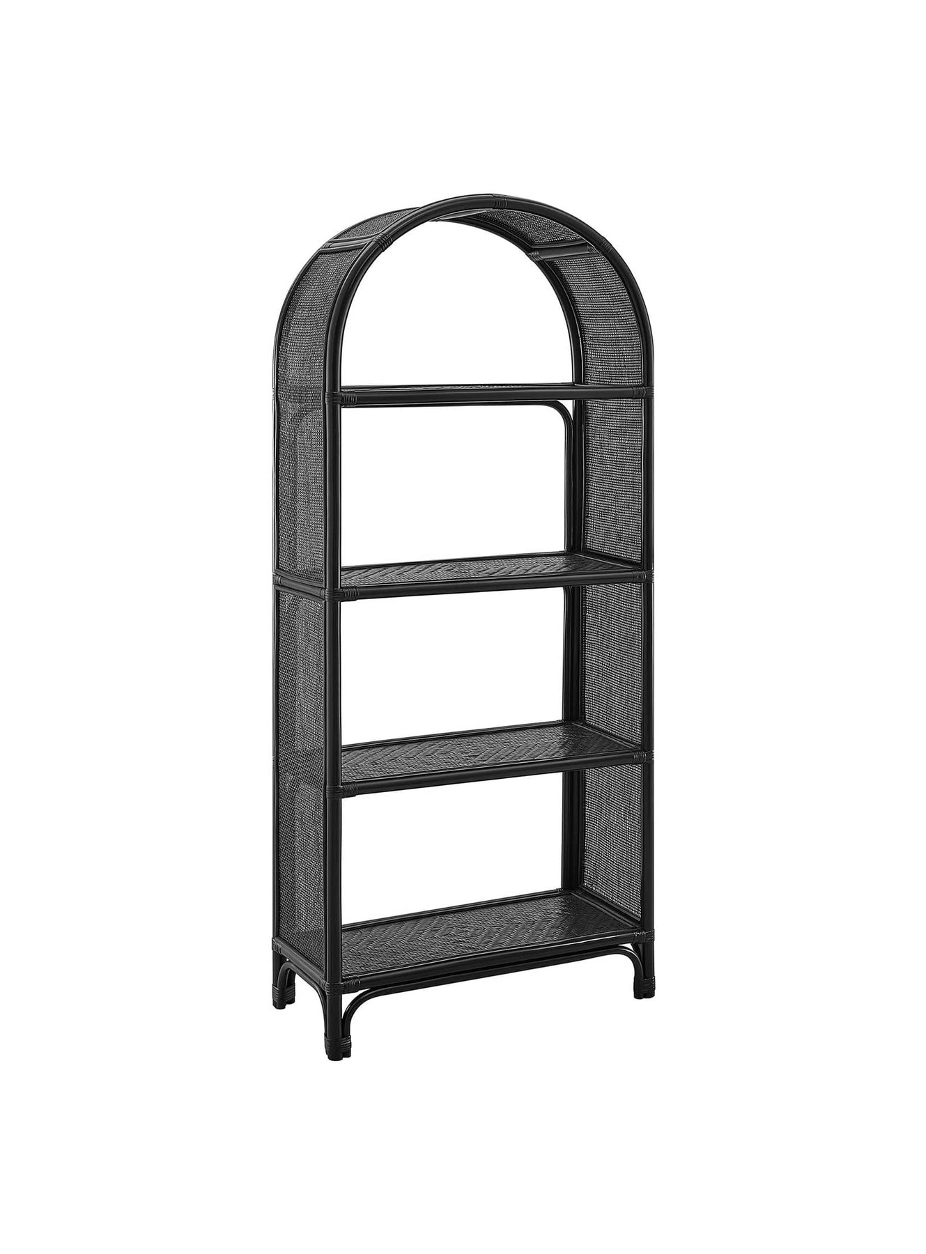 Bibliothèque arquée Celeste : design bois et rotin, charme naturel et légèreté. Noir.