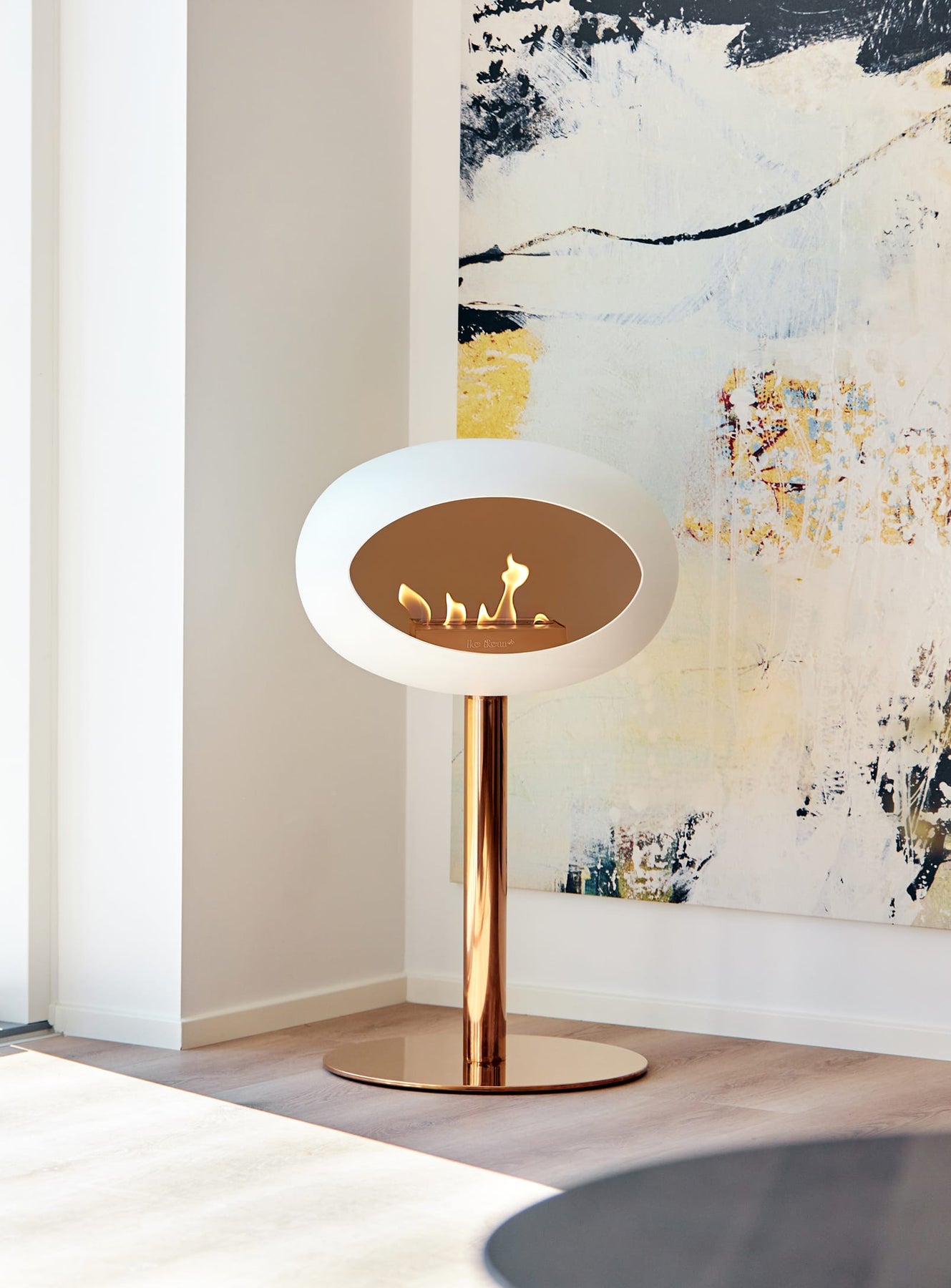 Le Feu Low Dome en blanc : cheminée autoportante chic et raffinée.