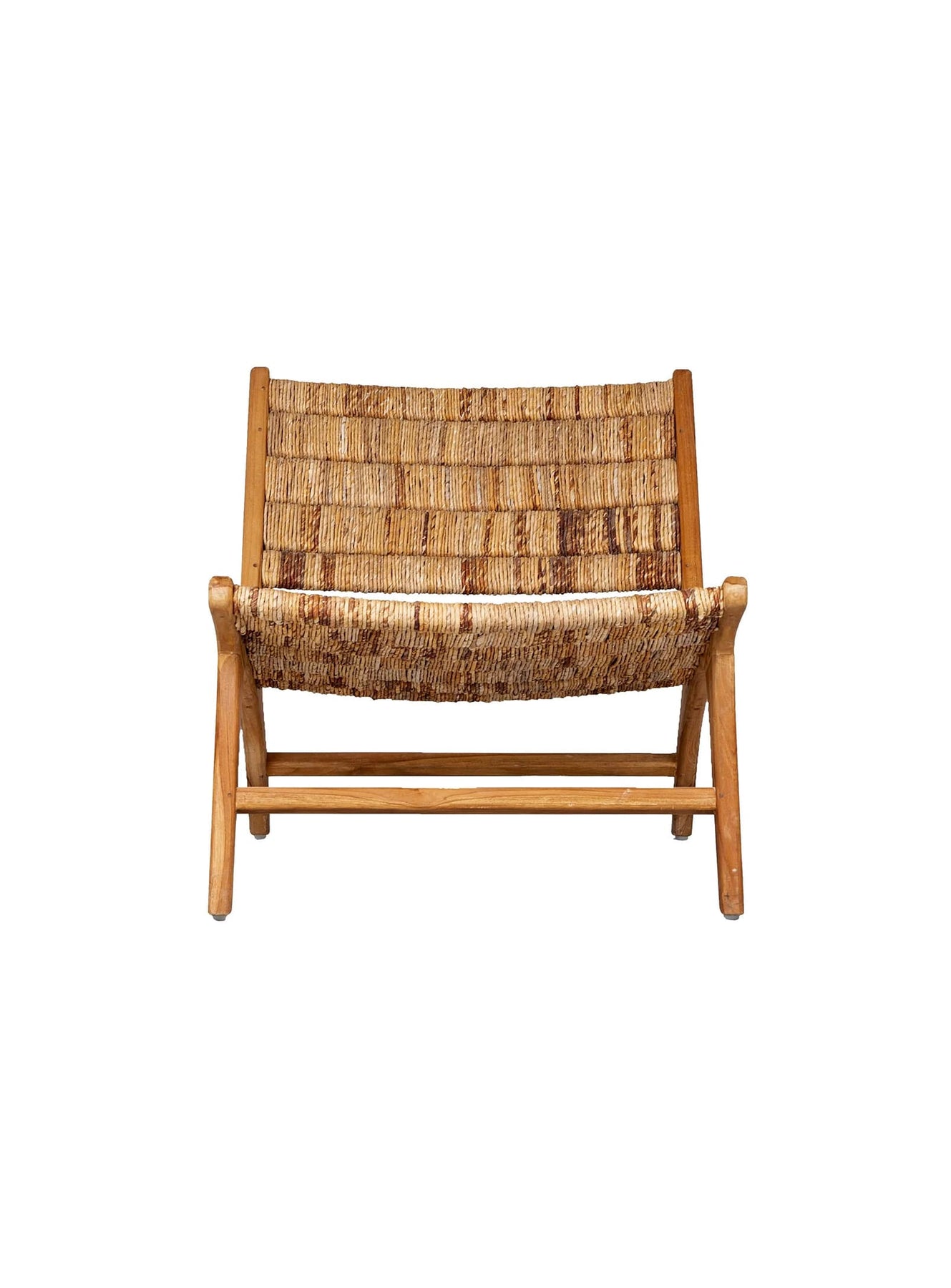 Le siège du fauteuil Caterpillar est confectionné en abaca tissé à la main, ajoutant une texture naturelle et un caractère artisanal à l'ensemble. L'abaca est une fibre extraite de la plante du même nom, offrant une durabilité et une résistance qui s'harmonisent parfaitement avec le bois de teck.