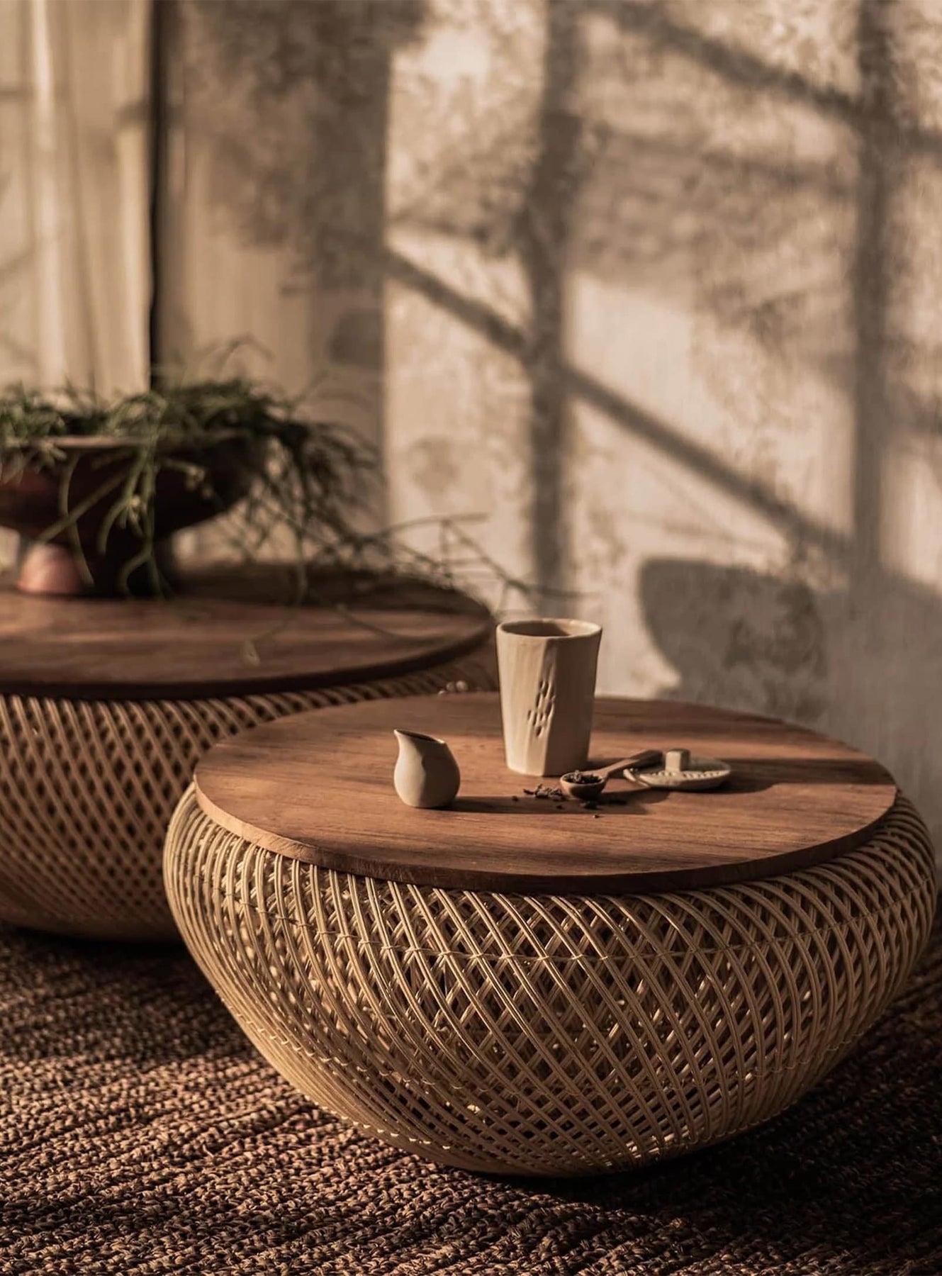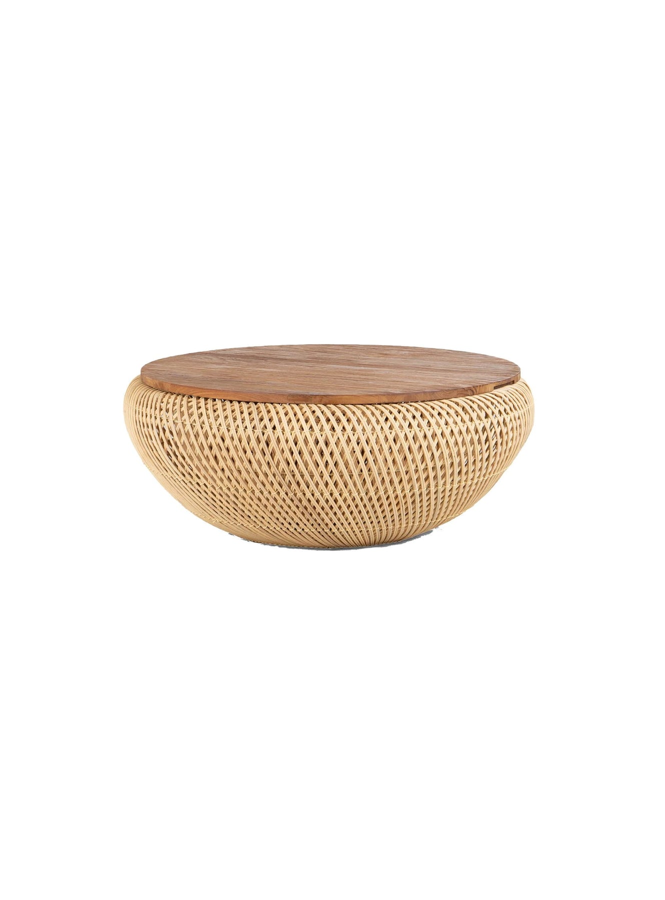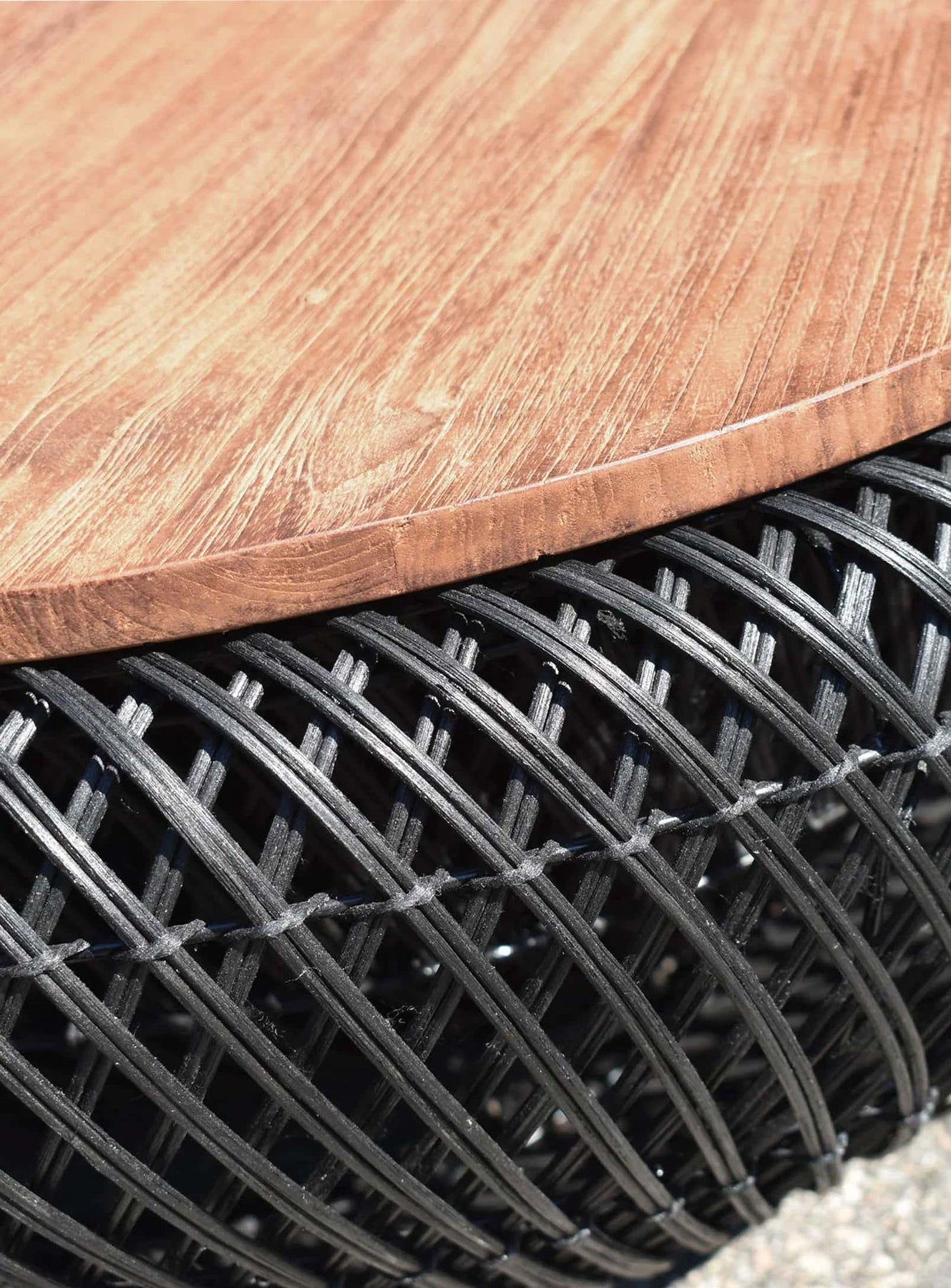 La base en rotin tressé traditionnel ajoute une touche artisanale à la table, évoquant des techniques de fabrication anciennes et un savoir-faire méticuleux. La finition naturelle de la base évoque la beauté de la roche volcanique ou la quiétude de la minuit tropicale, créant ainsi un contraste visuel captivant avec le teck recyclé du plateau.