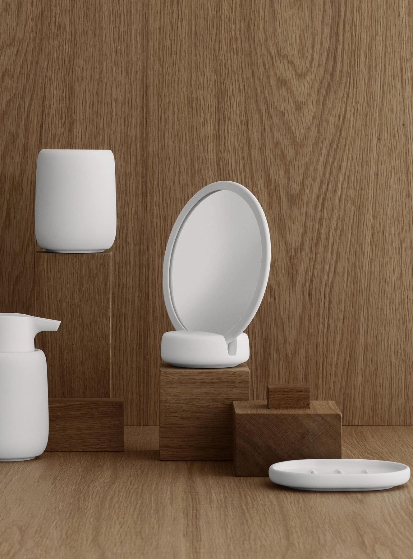 Blomus SONO : miroir beauté compact avec base stable et finition mate. Blanc.