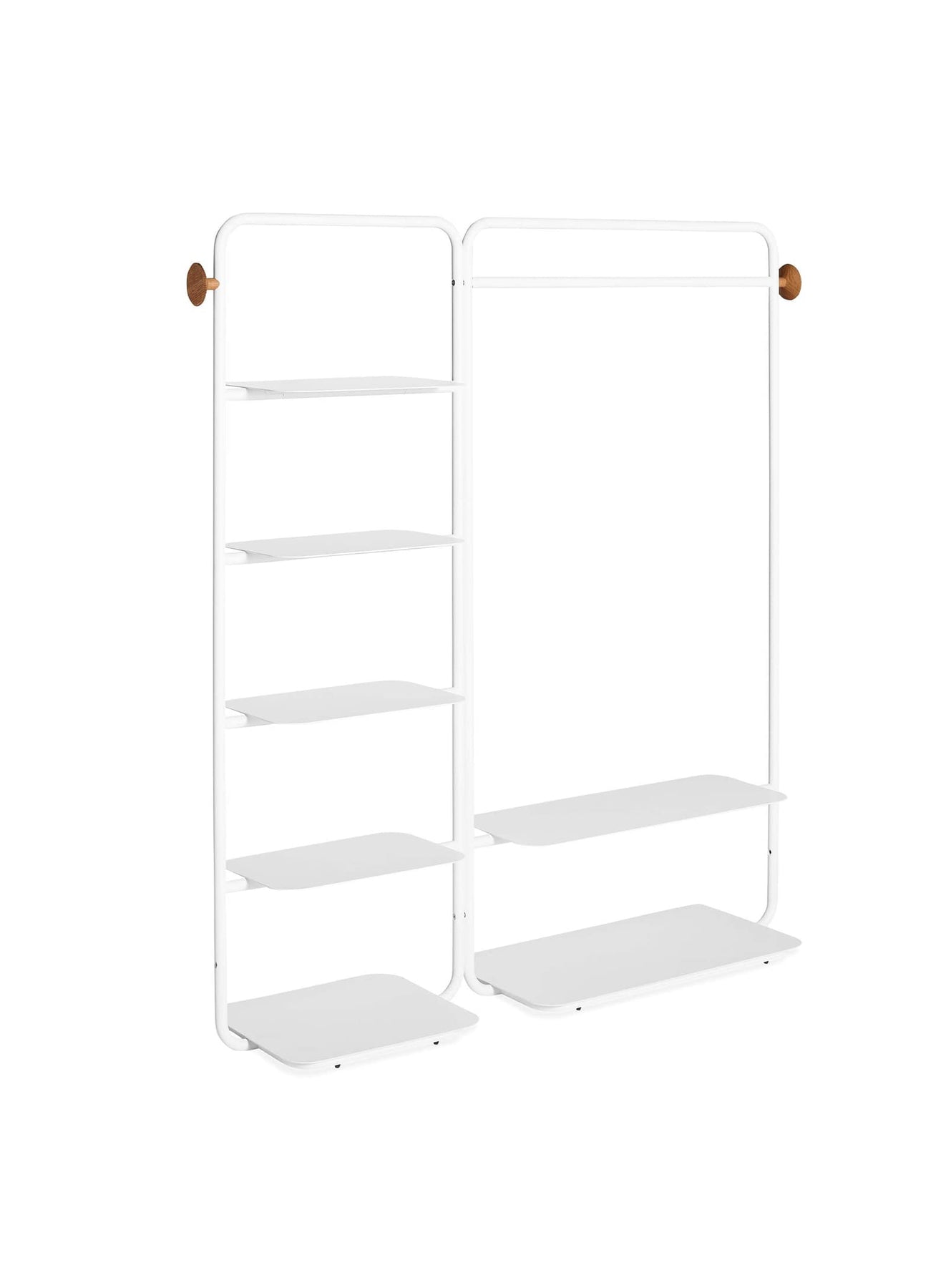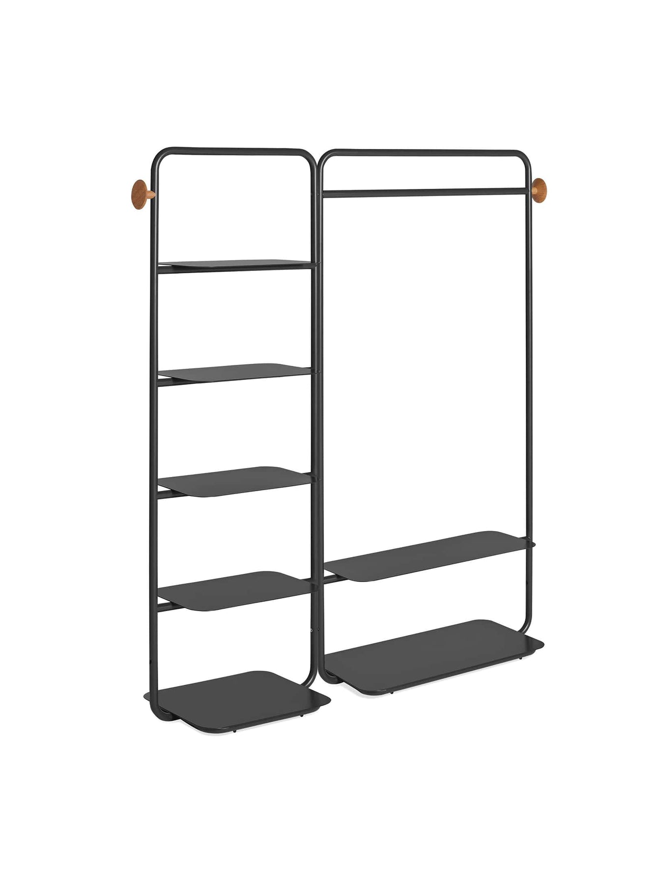Its powder-coated steel frame features slim, rounded lines, giving the unit an airy, contemporary look. Its understated silhouette blends seamlessly into any interior—from a modern bedroom to an urban studio—while providing generous storage capacity. The shelves allow you to display or organize clothing, shoes, and accessories, while the overhead rod provides an ideal space for hanging your everyday outfits or favorite pieces.