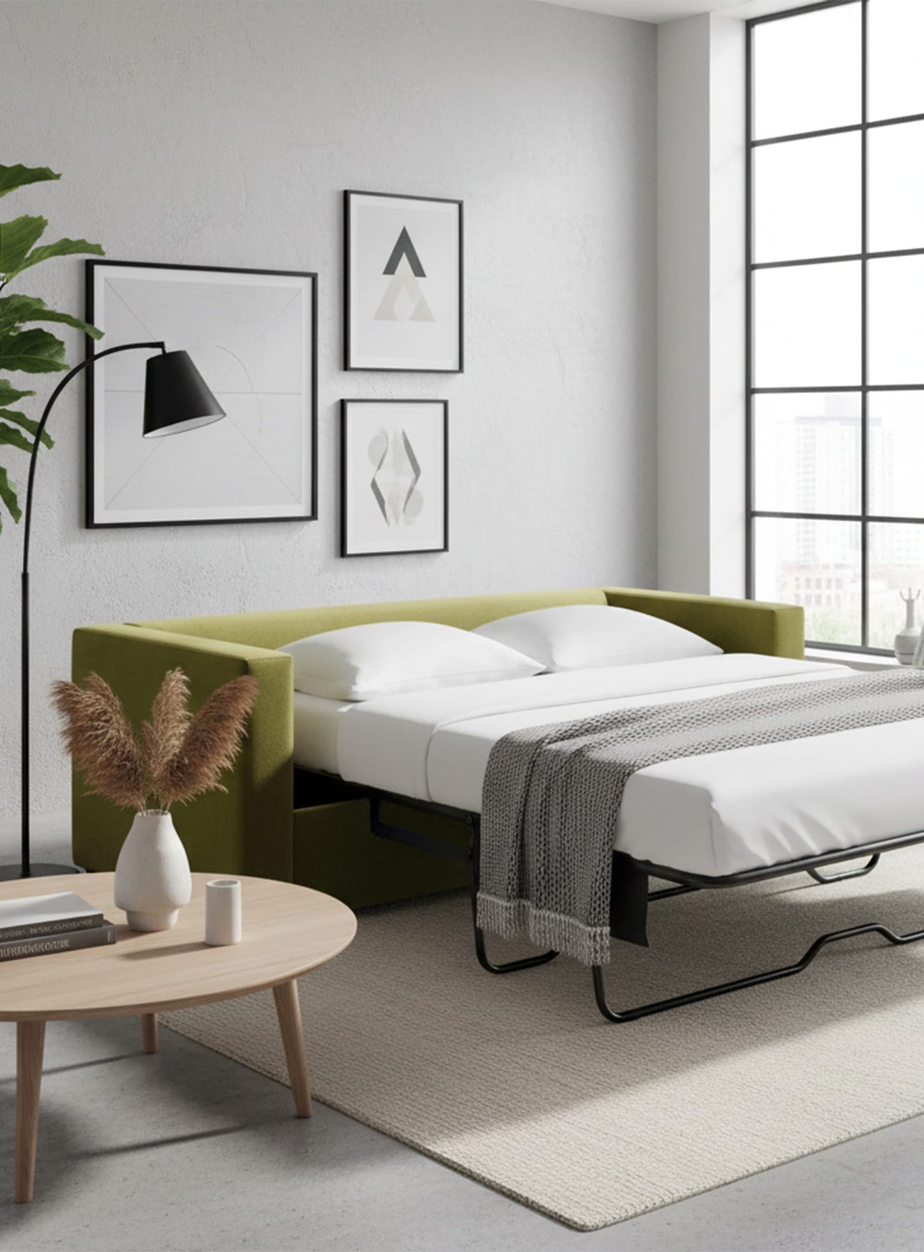 The Mono sofa bed from Blu Dot is the perfect solution for those who want to combine aesthetics, comfort, and functionality without compromise. Behind its sleek, modern look lies a true queen-size bed, ready to welcome your guests in an instant. Its smooth mechanism allows for quick transformation, effortlessly switching from an elegant sofa to a spacious and inviting bed.