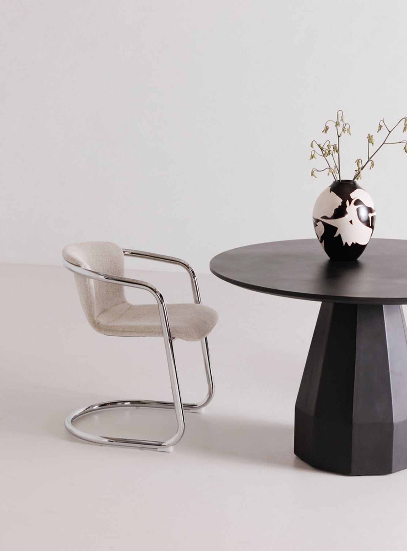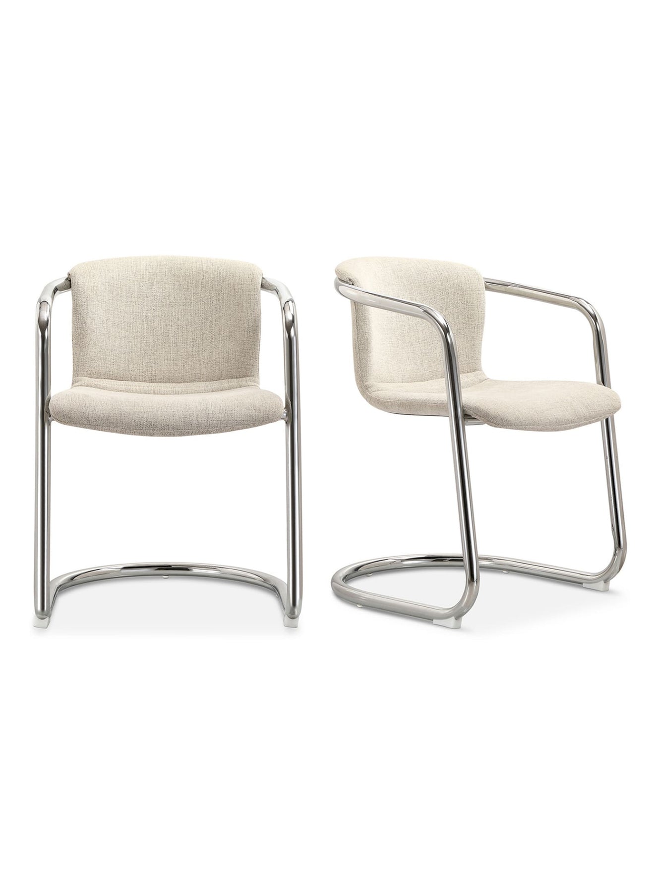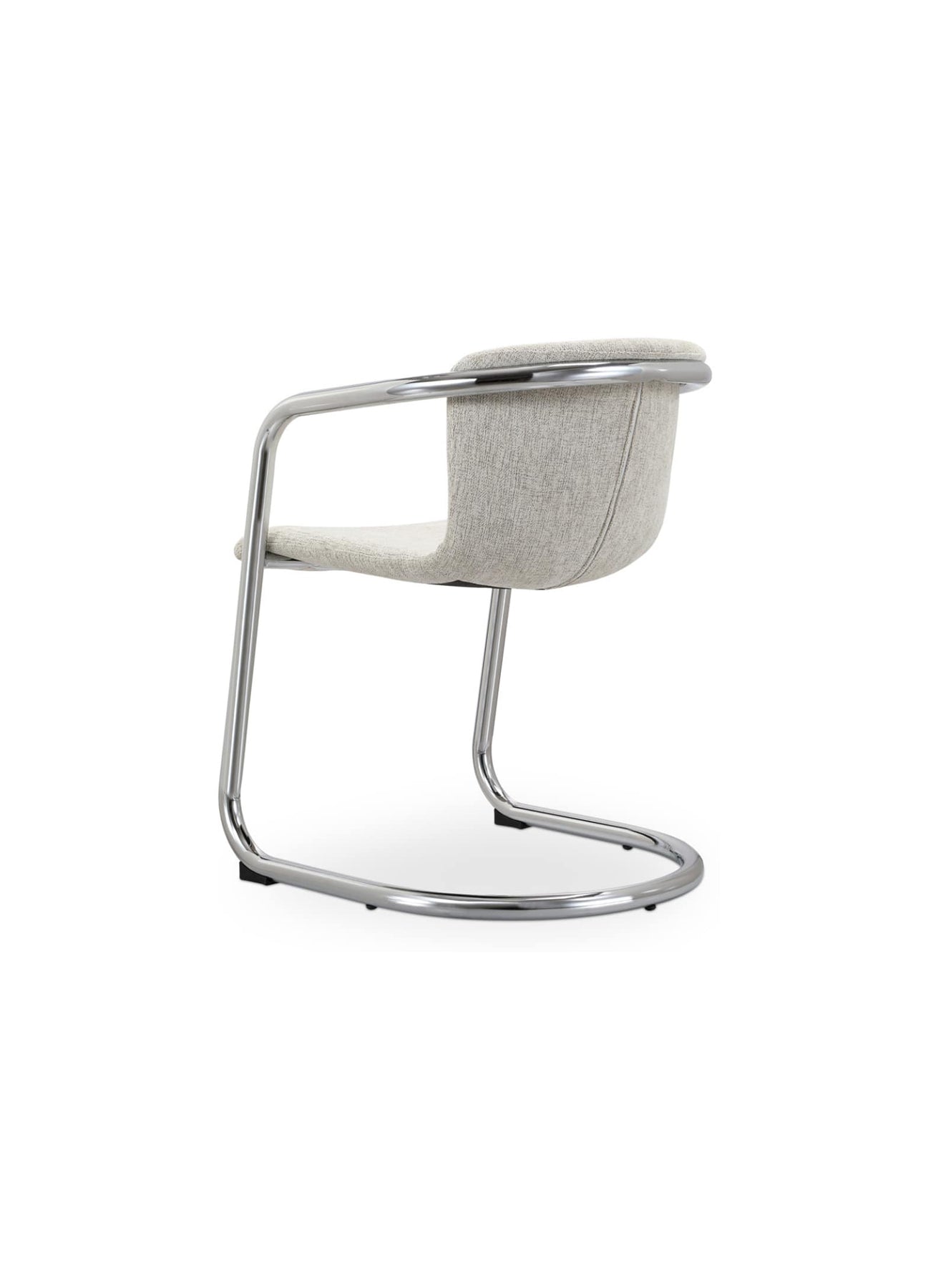 The Freeman dining chair embodies an aesthetic vision through which taste is expressed with confidence, warmth and passion. It seamlessly blends a modern industrial aesthetic with the luxurious sophistication of easy-to-clean fabric upholstery, all supported by a sleek industrial chrome metal frame. The result is a look that is both refreshing and retro that seduces the eye and invites comfort.