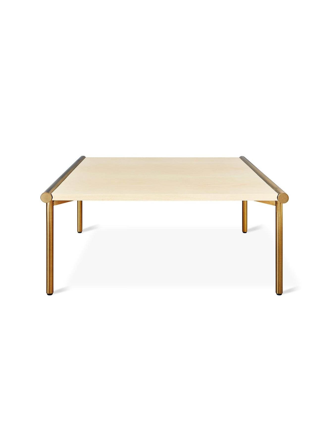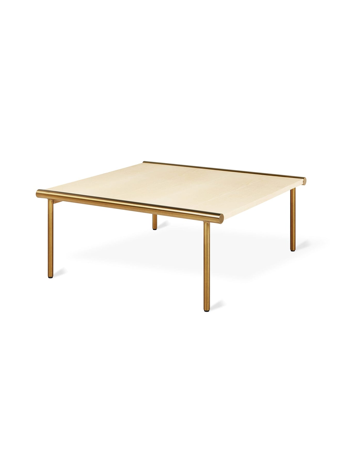 Table à café carré Manifold signée Gus* Modern, parfaite pour un salon minimaliste. frene et laiton
