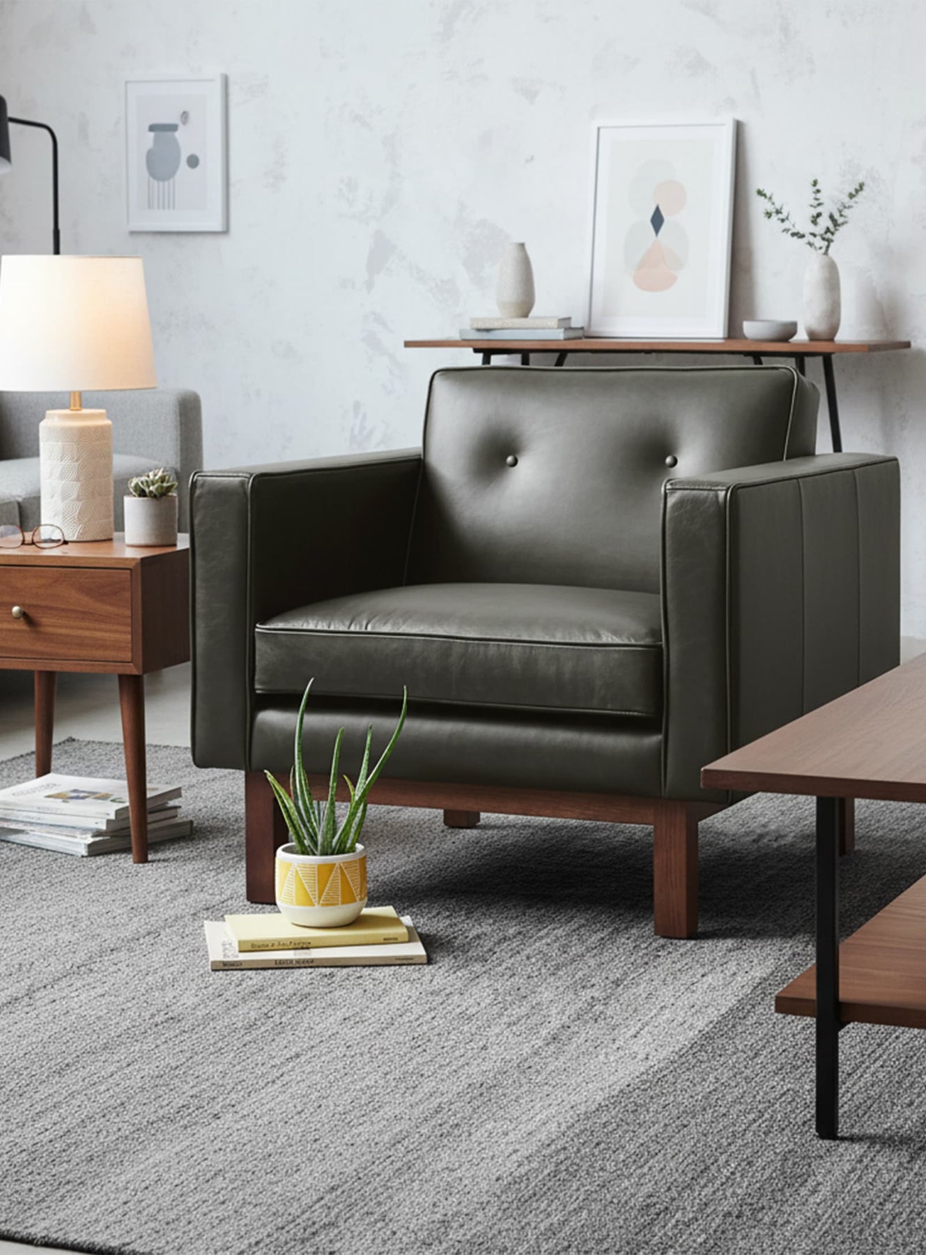 The Gus* Modern Embassy Series is a mid-century inspired furniture collection with a refined and timeless style. With its padded buttons in rich, textured leather, the sofa and armchair from this collection are centerpieces of any modern interior. The seat cushions are filled with a luxurious feather blend, which ensures optimal comfort for sitting and relaxing.