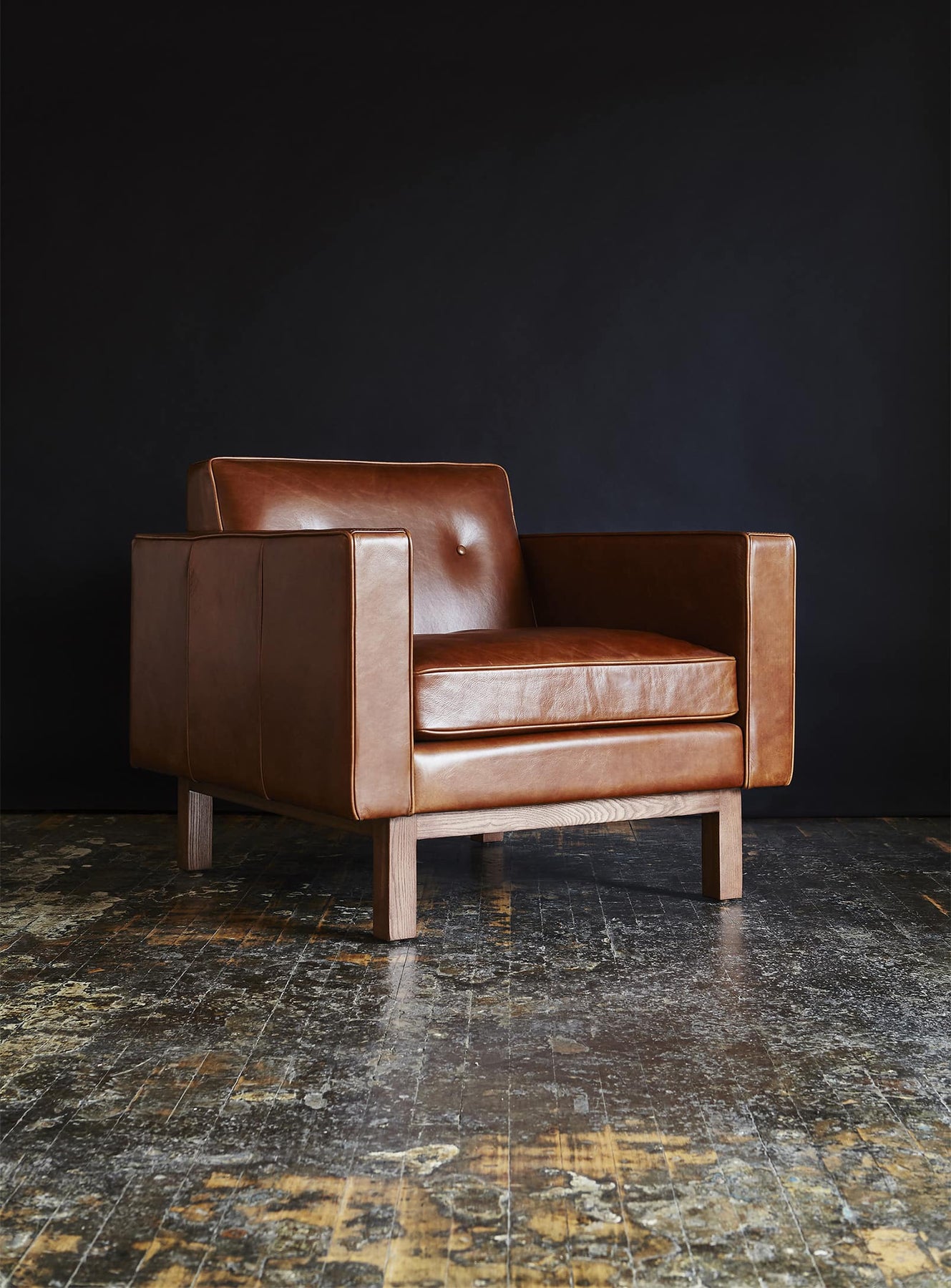 Le fauteuil Embassy de Gus* Modern : cuir raffiné et base en bois massif encastrée. Cuir tucson char