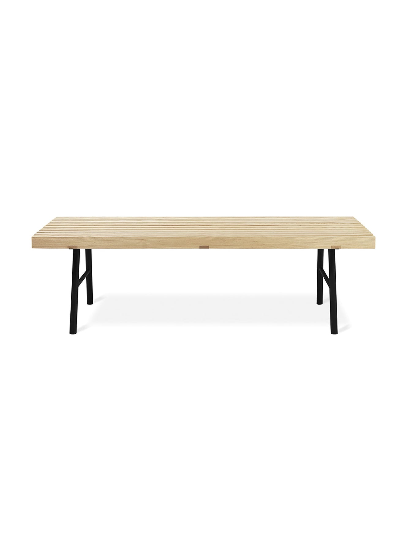 The Gus* Modern Transit Bench is a versatile model that can be used as seating in tight spaces such as entryways and bedrooms, or as a table in the living room. The surface, which creates a pleasing elemental pattern, is constructed with solid wood pieces that are assembled precisely in parallel to create a design that is both sturdy and lightweight. The legs are slightly flared for stability and are made from powder-coated tubular steel.
