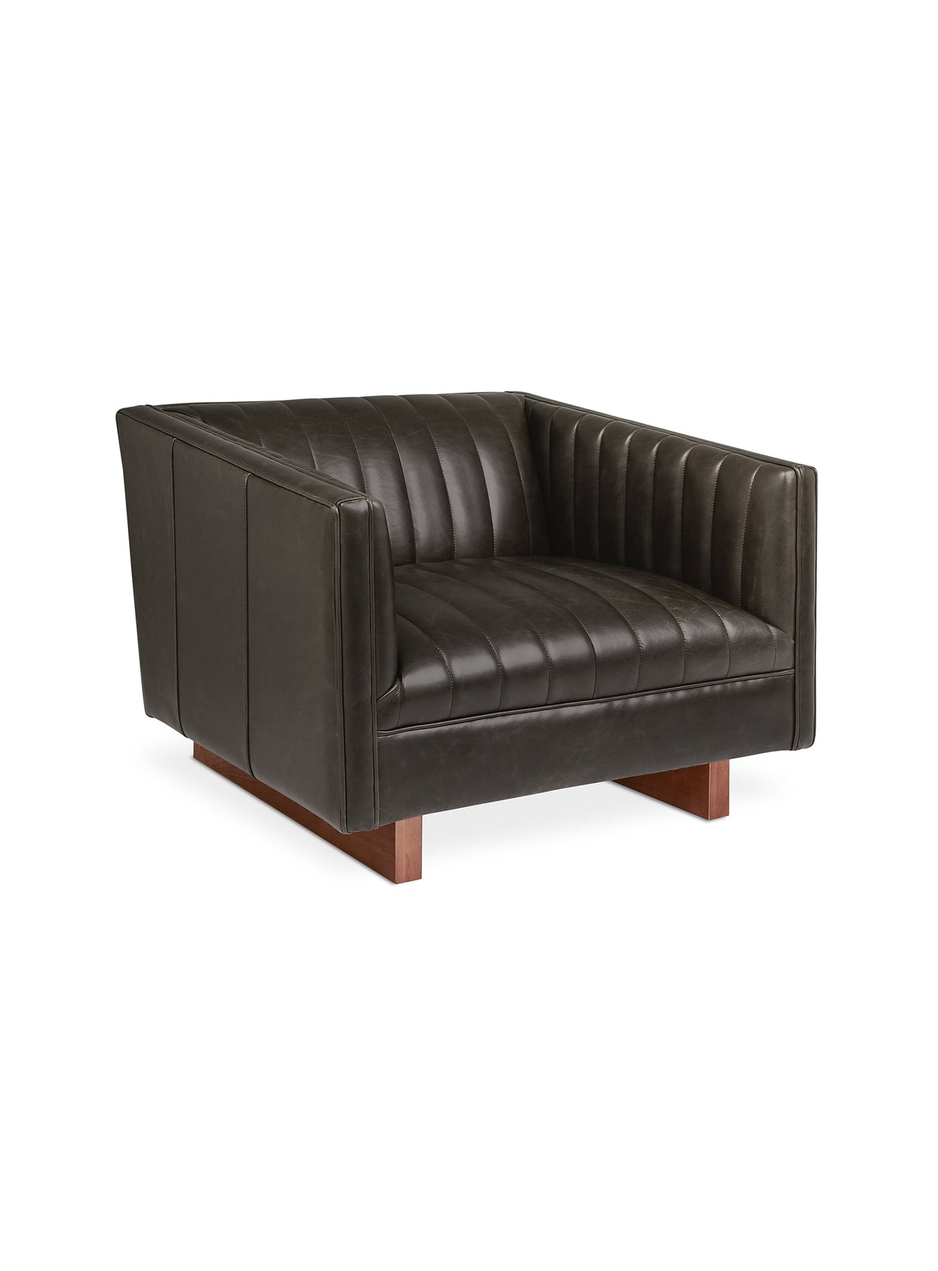 The Wallace Armchair from Gus* Modern is a masterpiece of classic elegance with a modern twist. Inspired by English Chesterfield design, it offers a contemporary interpretation of this timeless classic. Channel-stitched leather is used for the seat, back and arms, creating a visually stunning and incredibly comfortable surface. The piped details, angled arms, and angular wooden base add a sculptural, modern touch to the chair's overall aesthetic.