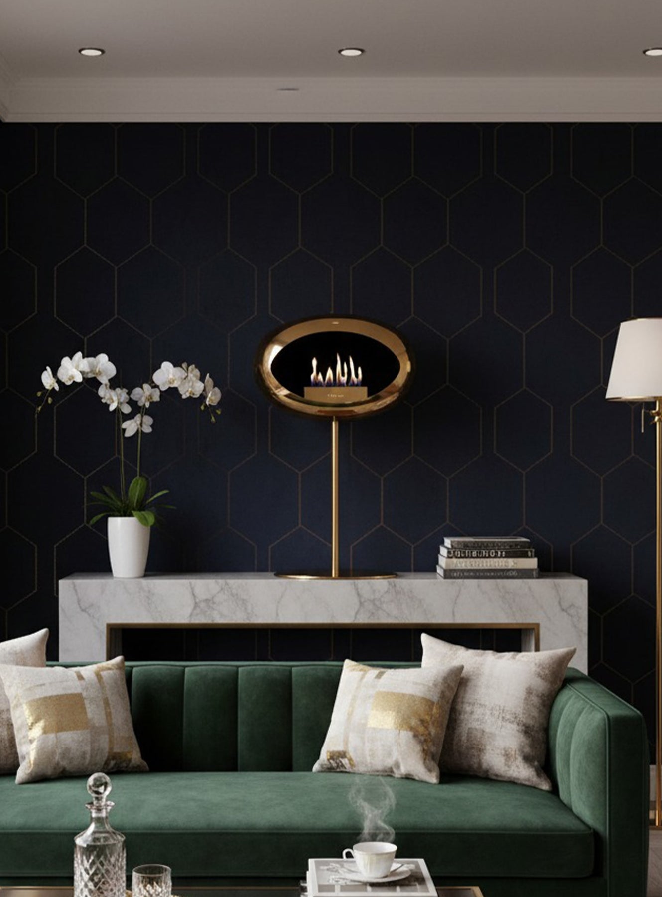 Cheminée autoportante Low Dome en or rose de Le Feu : atmosphère chic.