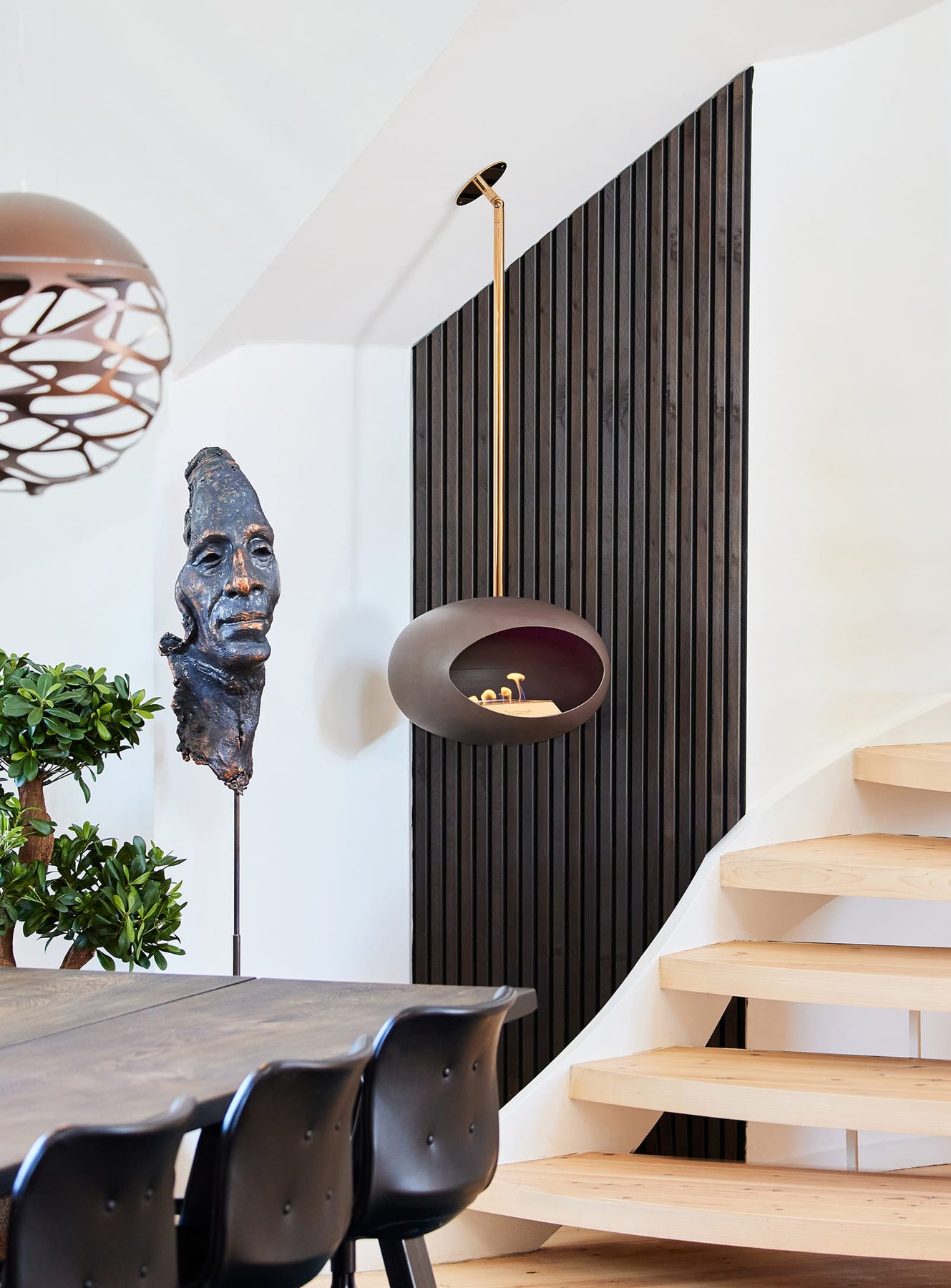 The almost levitating flame diffuses a soft, comforting light. It invites relaxation, transforms a simple moment into a warm interlude, and adds character to any room, from a cozy living room to a designer dining room. Thanks to a modular mounting system, the Sky Dome easily adapts to ceilings of varying heights and can be customized with accessories to suit the configuration of your space.