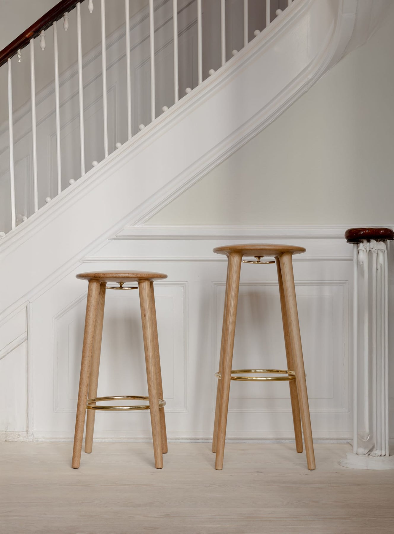 But the real magic is in the practical details. Underneath the stool's seat is a subtle, yet ingenious, brass hook. This small addition provides a stylish solution for hanging a lightweight jacket or handbag, allowing you to keep your belongings close at hand, while preventing them from lying around. It's a touch of functionality that greatly enhances the daily use of these stools.