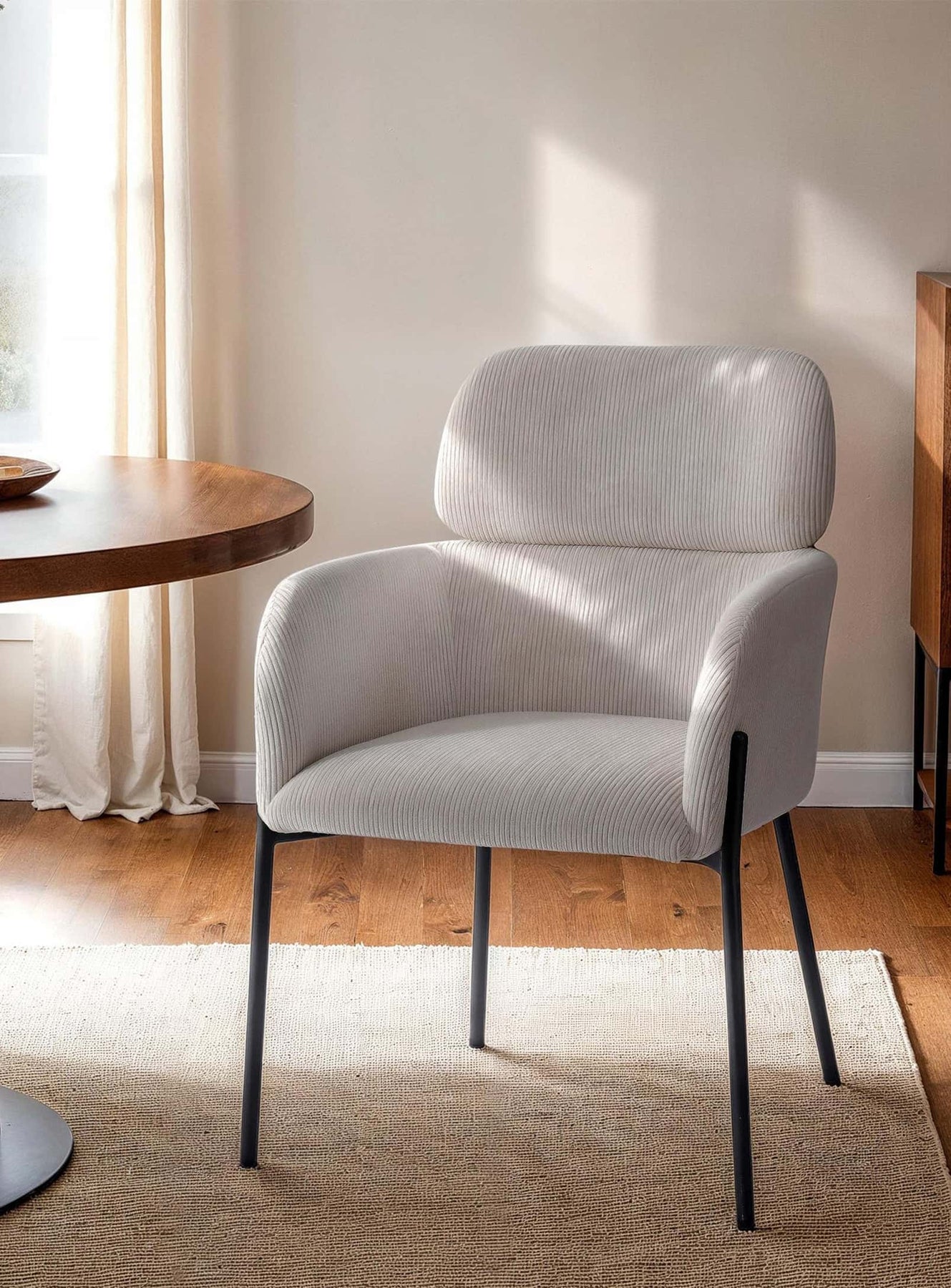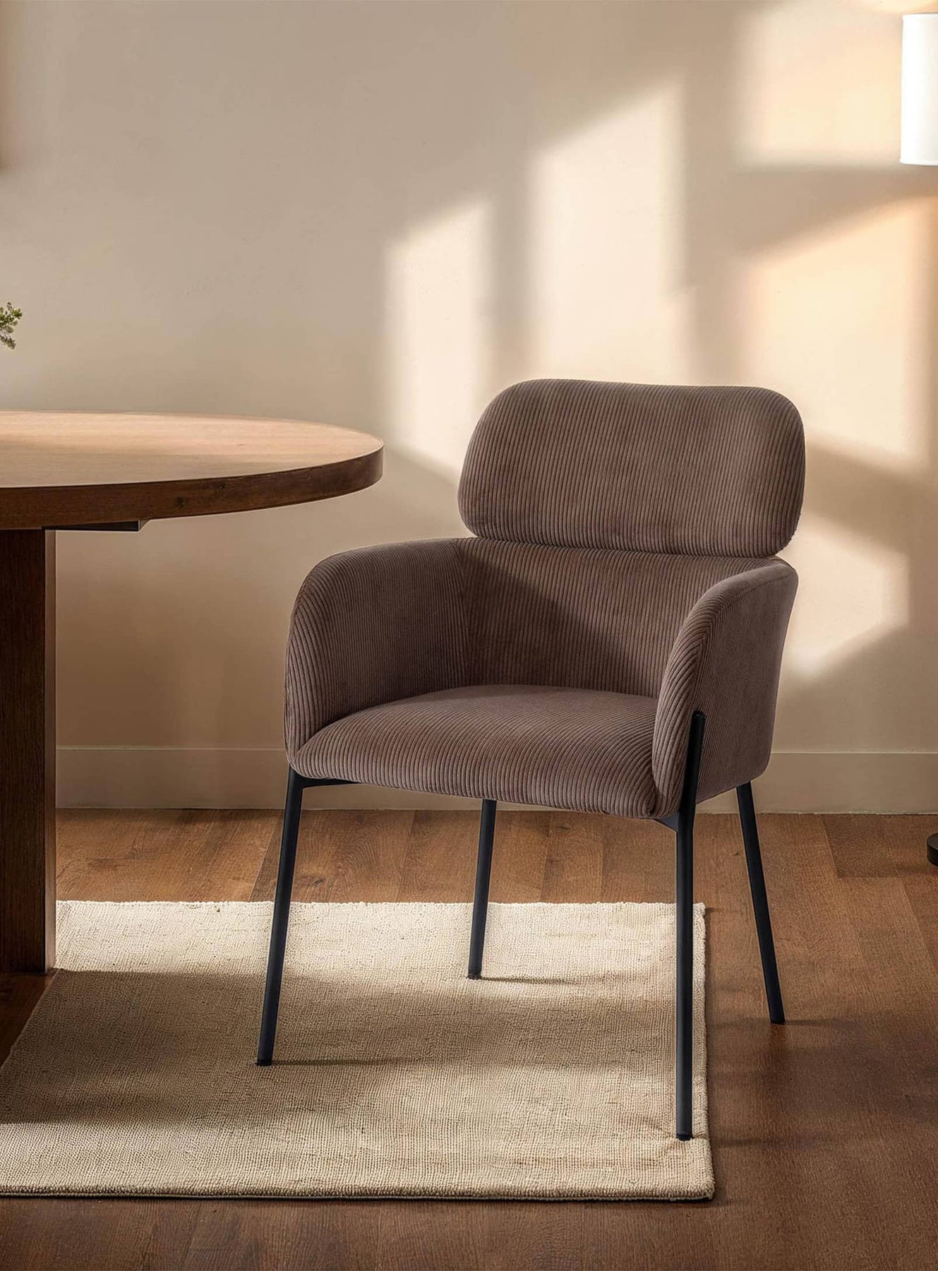 The corduroy upholstery adds a soft, luxurious texture while lending a timeless, warm style. This sturdy fabric stands up to wear and tear while bringing a touch of sophistication to your dining space.