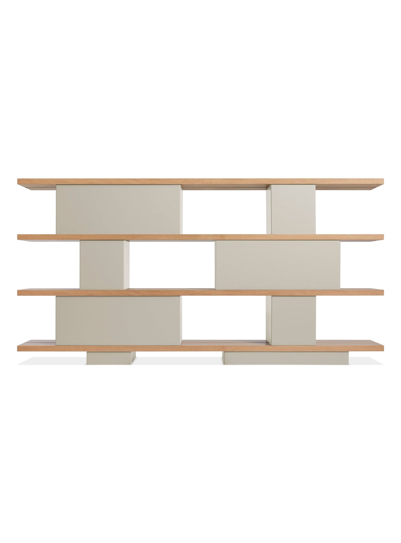 The subtle interplay between the two block widths—those serving as legs and those integrated into the shelves—creates a slight asymmetry that adds rhythm to the structure. This contrast in proportions brings a modern visual touch while ensuring impeccable stability.
