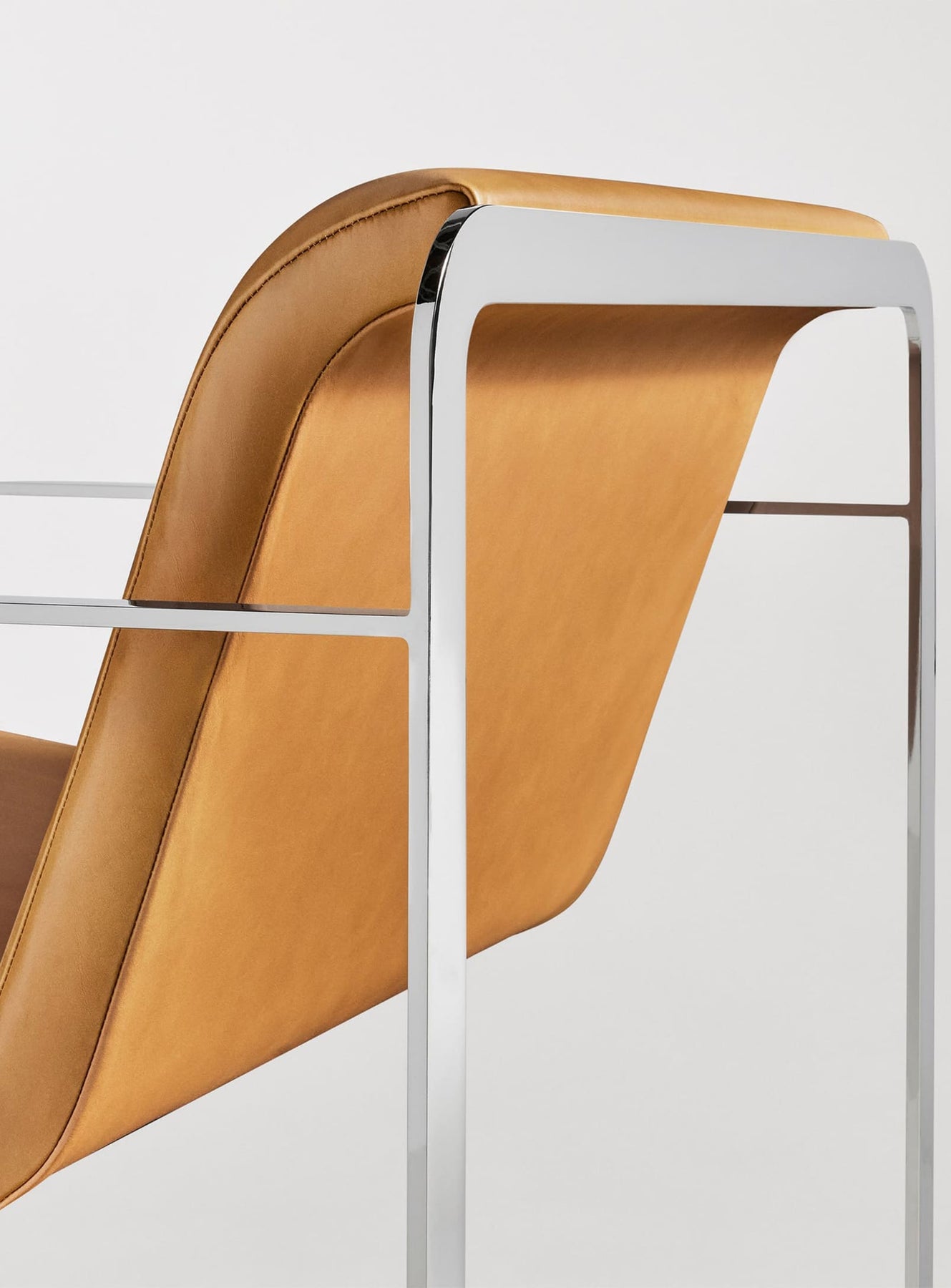Fauteuil Skald de Blu Dot, design fluide et confort haut de gamme. cuir camel