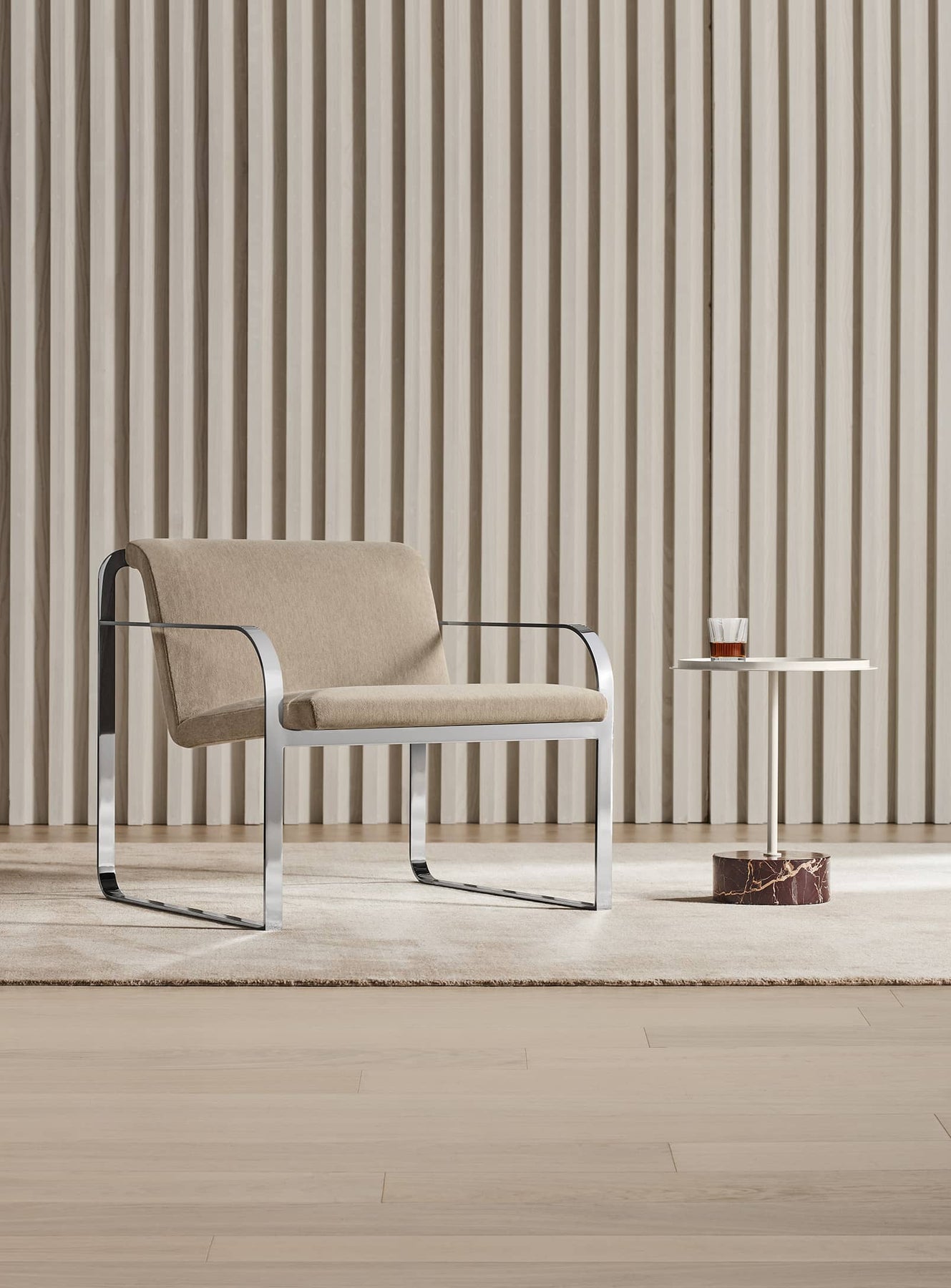 The polished chrome-plated or powder-coated steel frame provides a sturdy and elegant base, while the wooden shell is carefully padded with high-resilience foam and wadding for lasting comfort. The ergonomically curved seat and backrest invite relaxation, whether for a moment of reading, a conversation, or simply admiring the piece itself. Integrated plastic glides protect floors while maintaining the chair's stability.