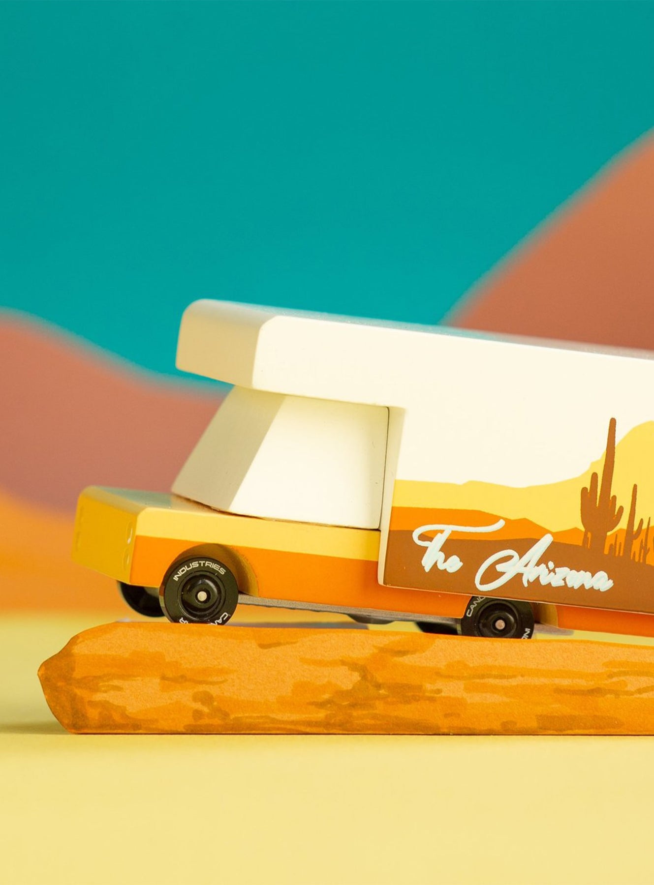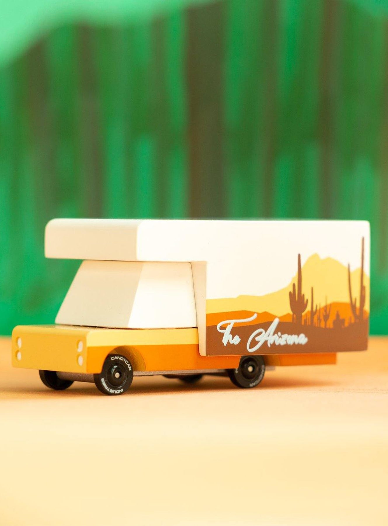 Arizona RV Candylab, jouet en bois évoquant liberté et routes sans fin.