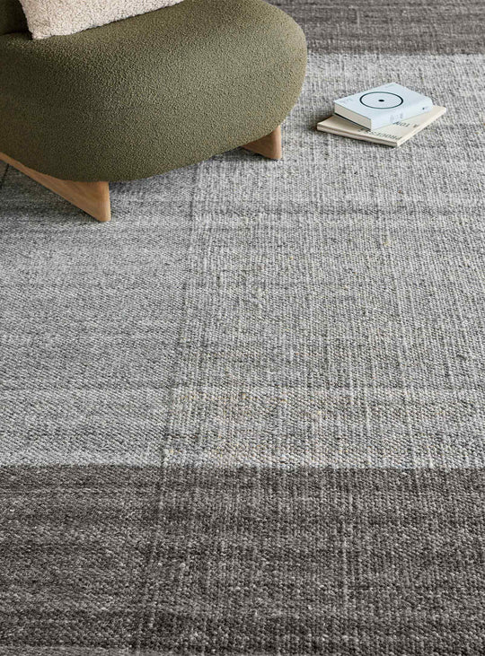 Its flat weave and low profile make it a smart choice for dynamic living spaces, where furniture takes up a lot of space and traffic is frequent. The Echo rug blends easily into a variety of environments, thanks to its nuanced gray palette and subtle tonal variations, which add depth without ever overpowering the space. This chameleon-like character allows it to harmonize with a variety of decors, whether minimalist, contemporary, or warmer.