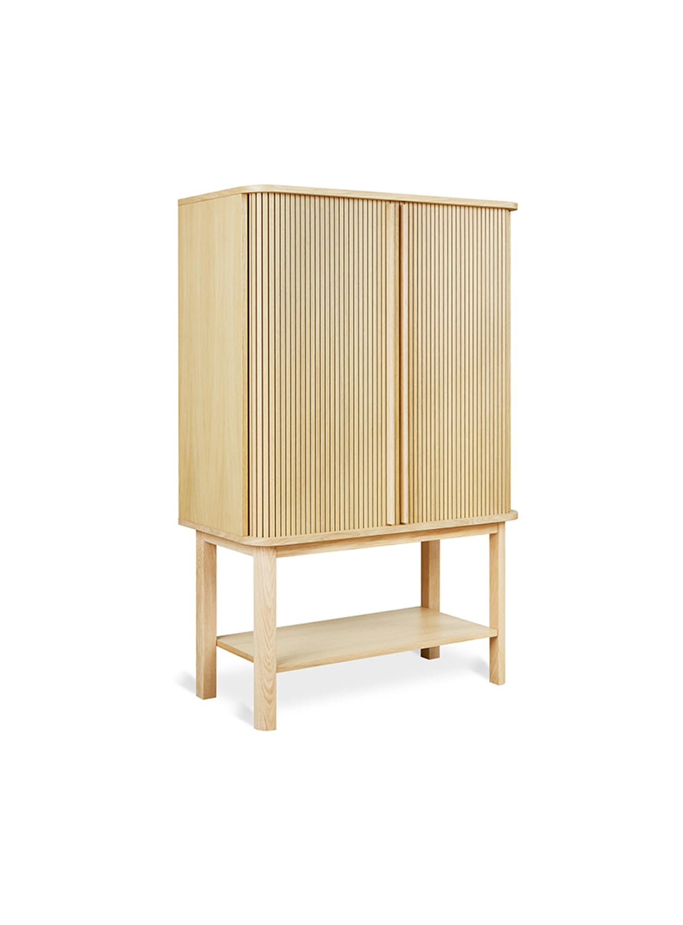 The Ledger Cabinet by Gus* Modern is a sleek, contemporary storage solution that combines refined aesthetics with ingenious functionality. Its wooden tambour sliding doors, a true design centerpiece, glide fluidly along the structure, revealing or concealing your contents with style and discretion. This piece of furniture with its elegant proportions and craftsmanship adapts perfectly to a variety of uses: whether it is to organize your living space, store your belongings or showcase collectibles, the Ledger cabinet meets all your expectations.