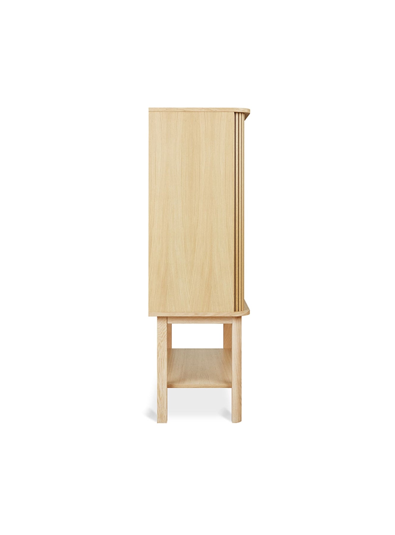 The tambour doors, which extend effortlessly from the back of the cabinet, showcase a clean, minimalist design with no visible hardware. This innovative mechanism highlights the beauty of form following function, providing ease of use without compromising aesthetics. The cabinet’s graceful curves and warm wood grain add an organic, inviting touch to any interior, while the natural, VOC-free finish preserves the integrity of the materials and the health of your environment.