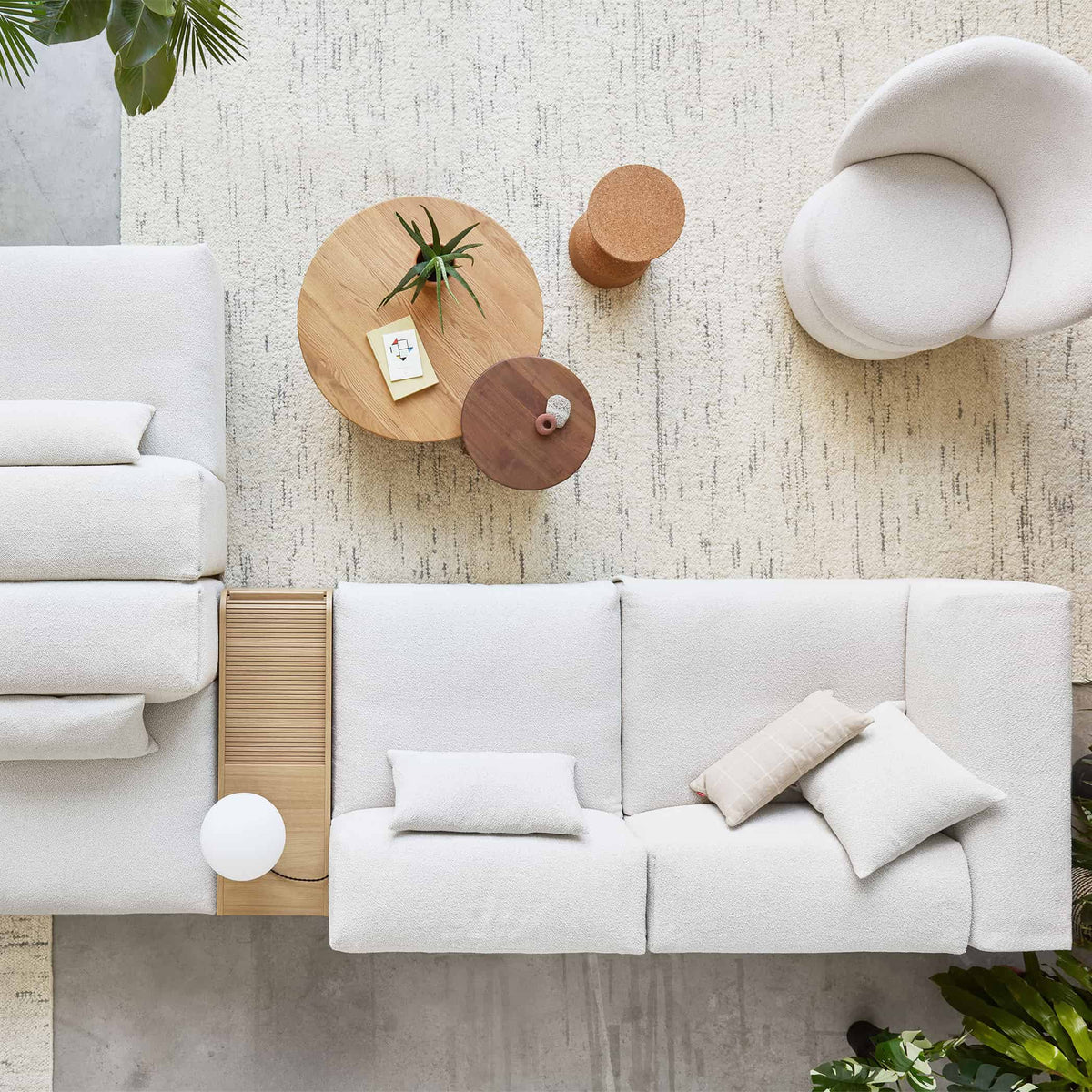 Sofa Nest de Gus en tissu bouclé crème avec forme douce et structure modulable. morris scoria.