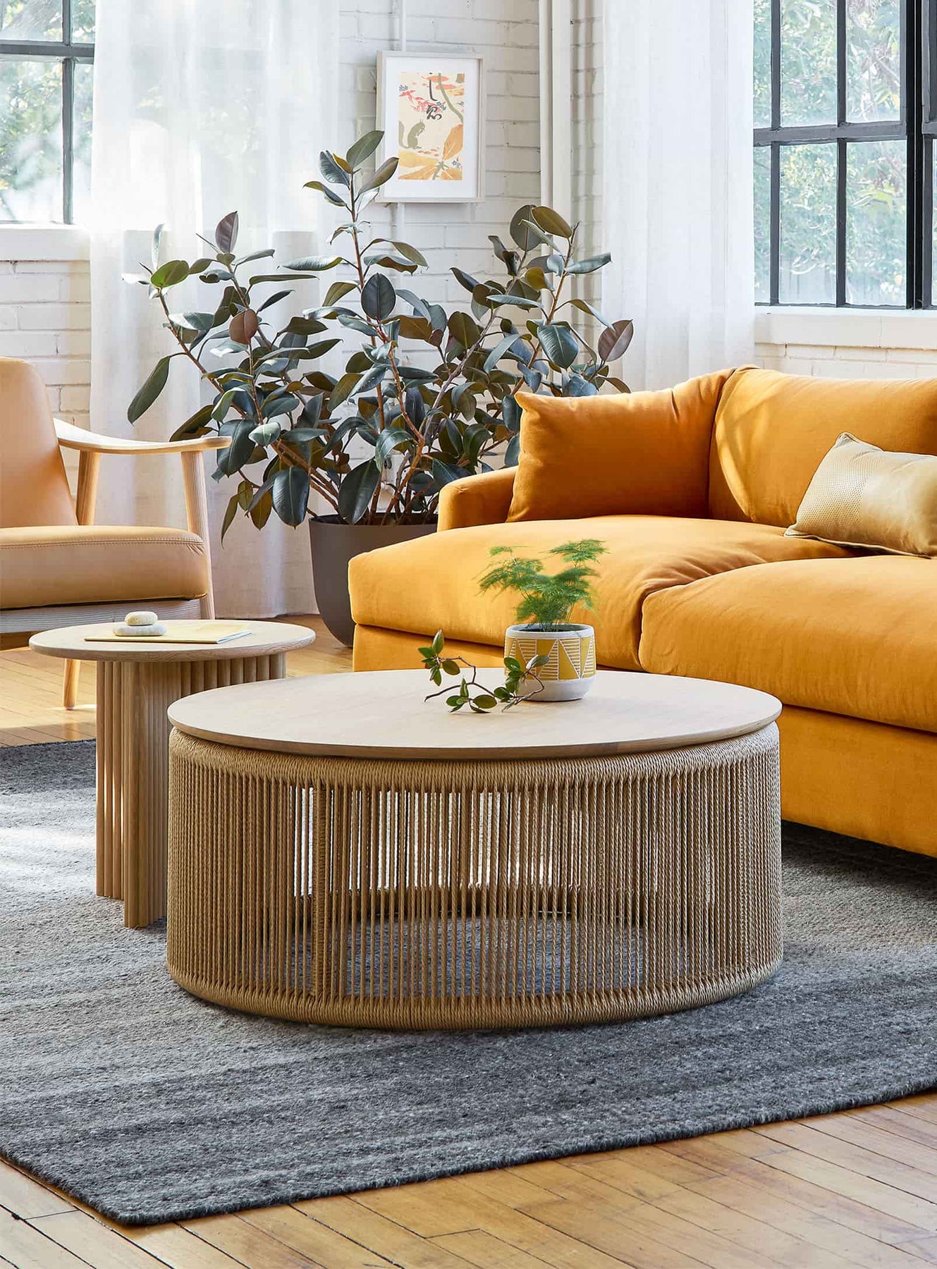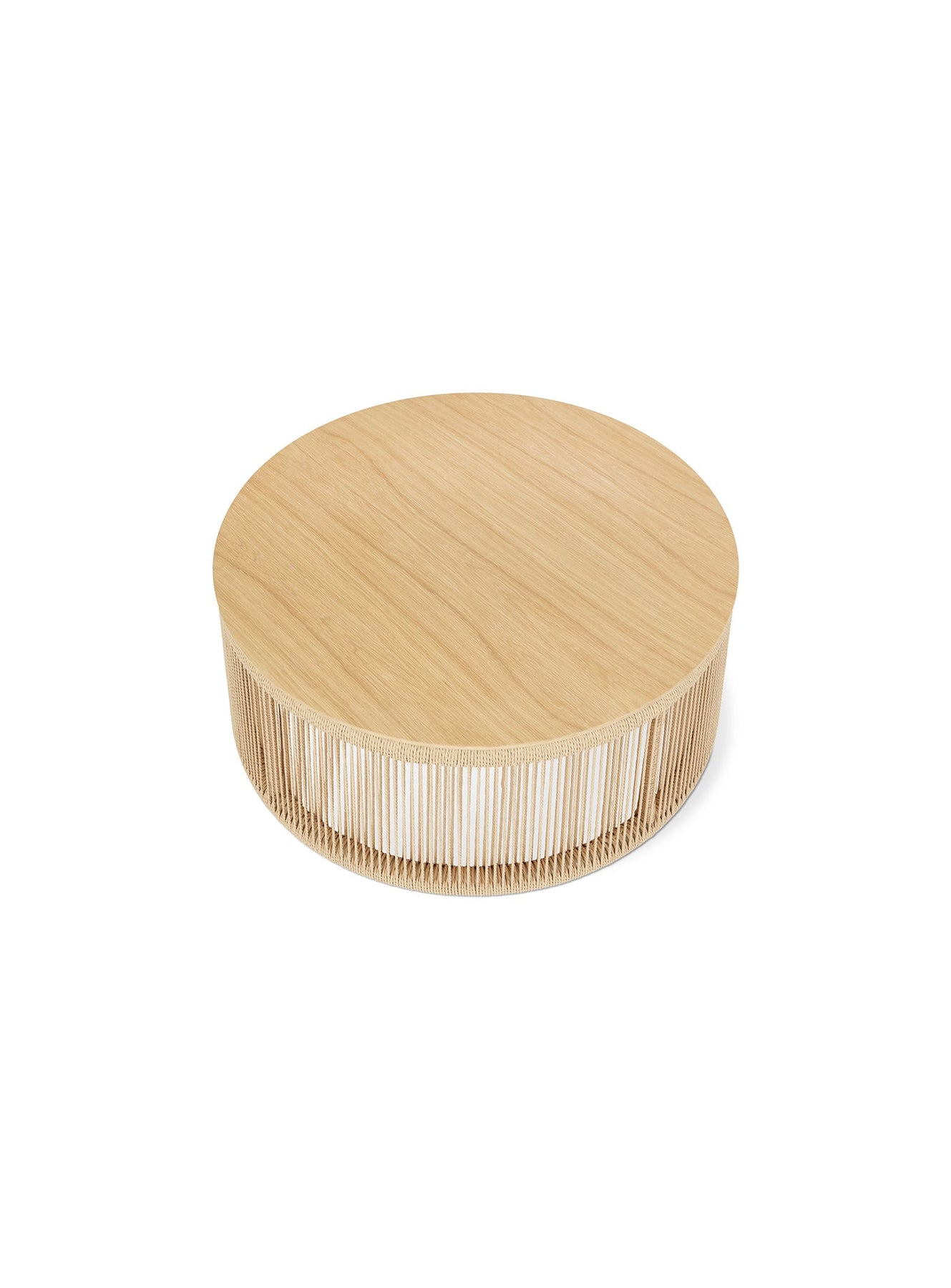 At the heart of its design, the perimeter of the Palma coffee table is expertly wrapped in Danish rope, an age-old technique loved by mid-century designers for its resilience, sturdiness and welcoming texture. This rope, derived from natural wood fibers, is continuously woven to form a dynamic visual pattern, giving the table both a feeling of solidity and airy lightness.