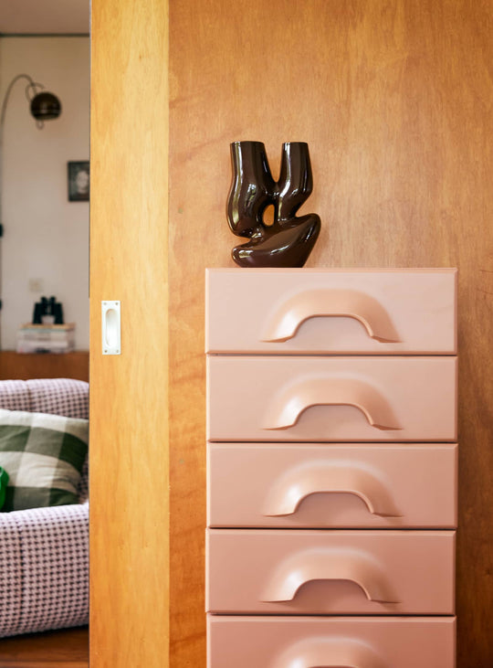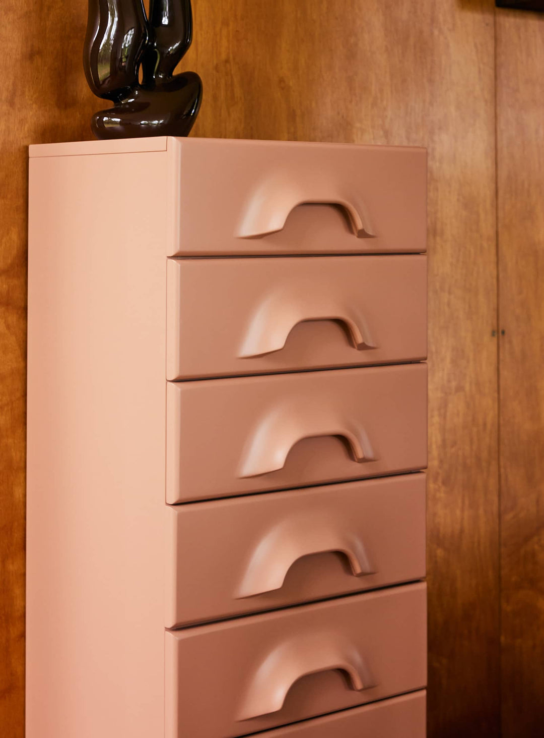 Une commode rose poudré de HKliving qui allie charme, ordre et fonctionnalité.