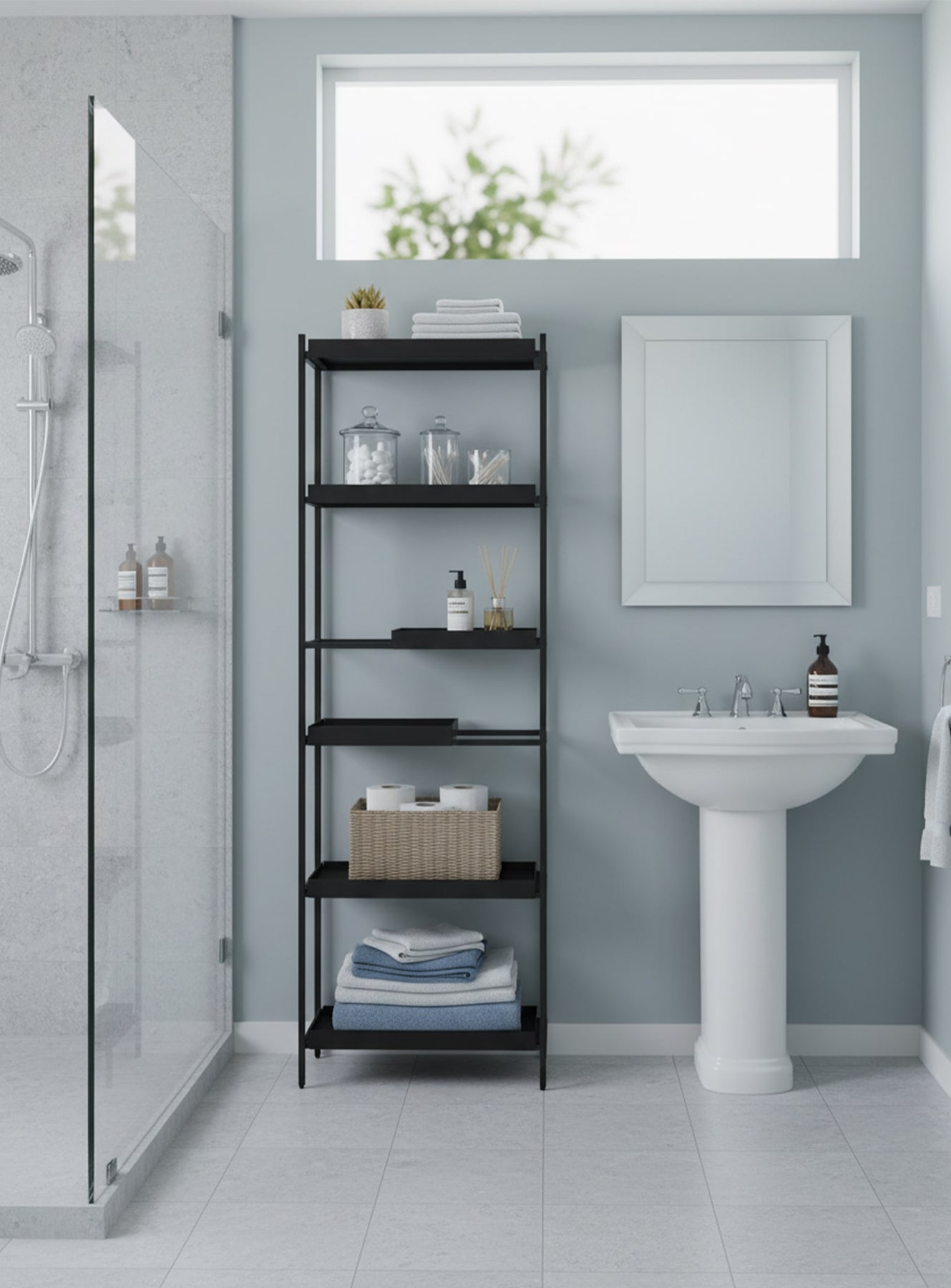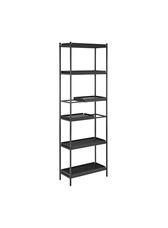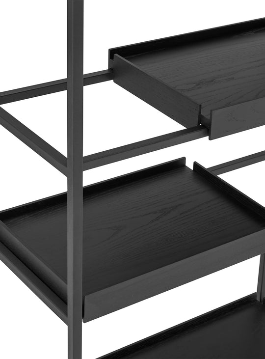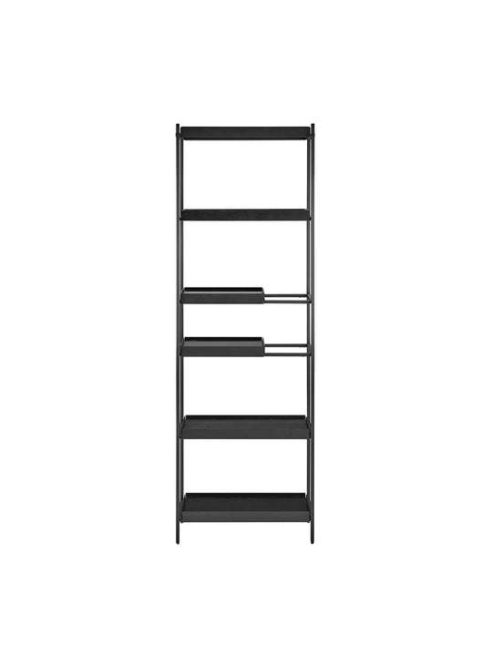 The Kumla bookcase stands out for its bold design and thoughtful functionality. Its modern look blends easily into any interior style, from the sleekest to the most contemporary. The matte black powder-coated steel frame gives it an elegant solidity, while the black-stained oak-veneered MDF shelves add a warm touch to the overall look.