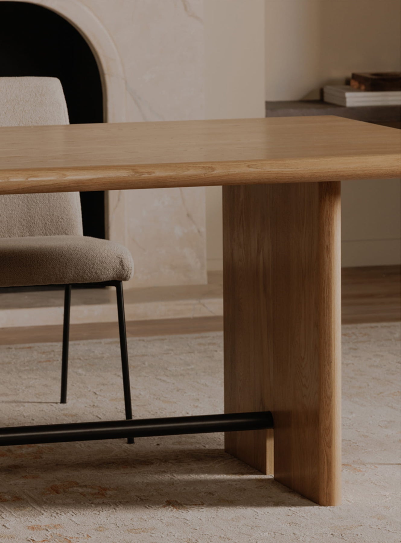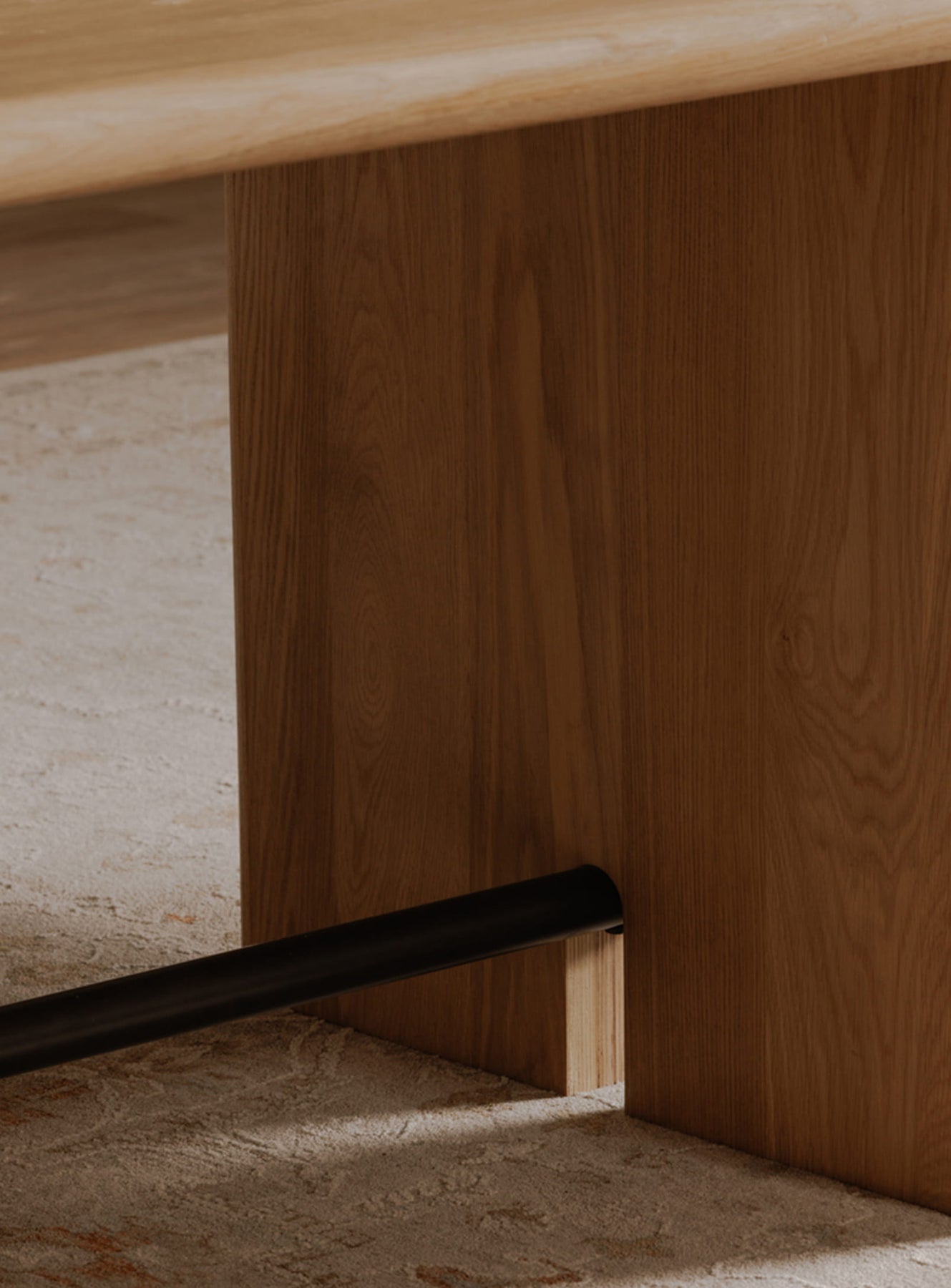 The base captures this subtle balance between clean lines and elegant curves, with a metal crossbar in a patinated bronze finish that underlines the whole with a discreet industrial touch. The combination of natural wood and metal creates a warm aesthetic, both modern and timeless, which fits equally well in a contemporary interior as in a more classic ambiance.