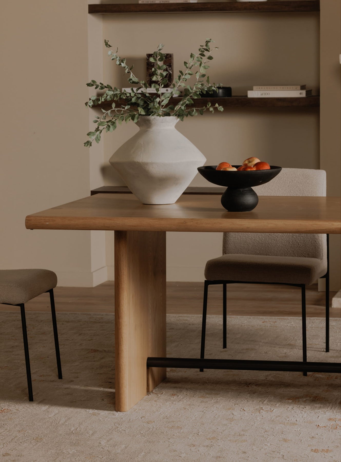 The tabletop and base edges are crafted from solid oak, while the oak veneer over plywood ensures stability and durability over time. This dining table strikes a beautiful balance between sophistication and functionality, perfect for everyday dining and special occasions.
