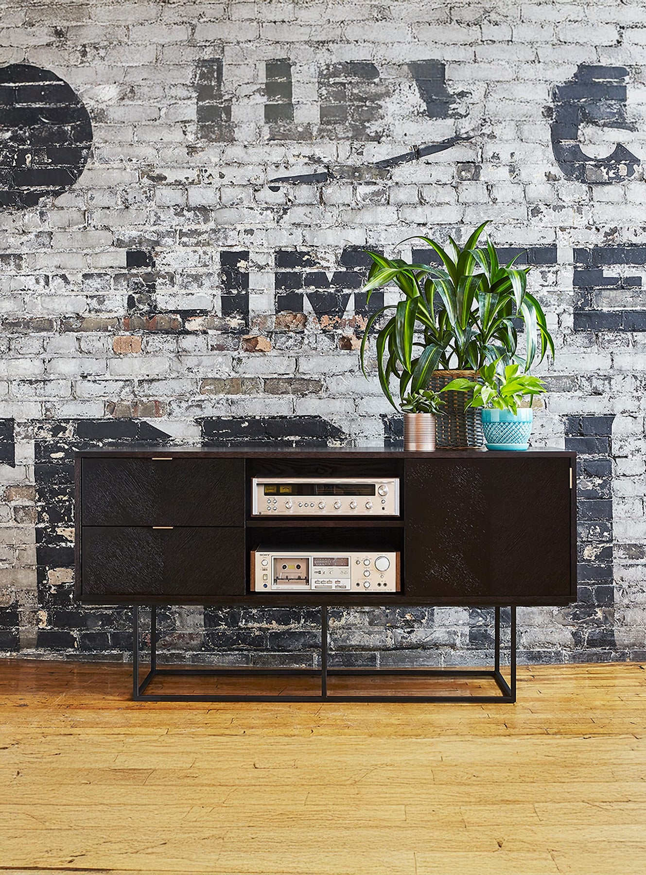 The Myles Collection TV Stand from Gus* Modern is a masterpiece of craftsmanship and simple sophistication. This sophisticated storage design is the result of the use of subtle details and exceptional craftsmanship. Herringbone stained oak faces give the piece a classic yet contemporary look, while rose gold handles add a subtle touch of luxury.