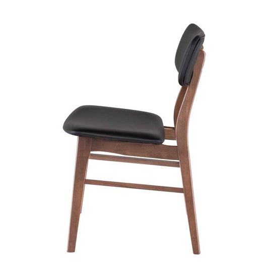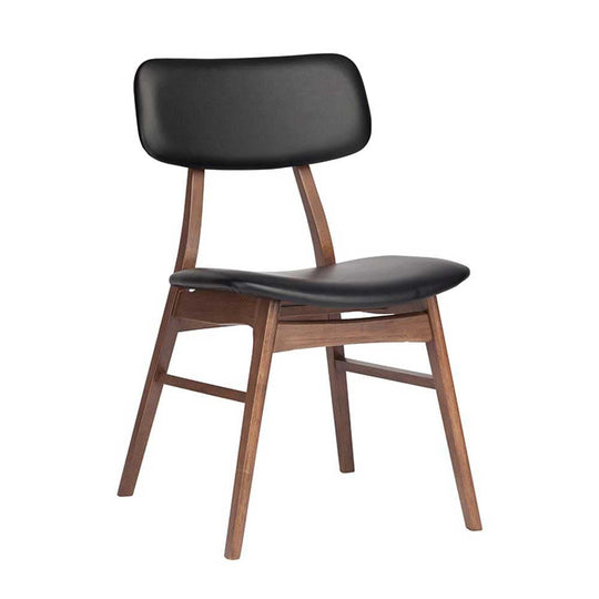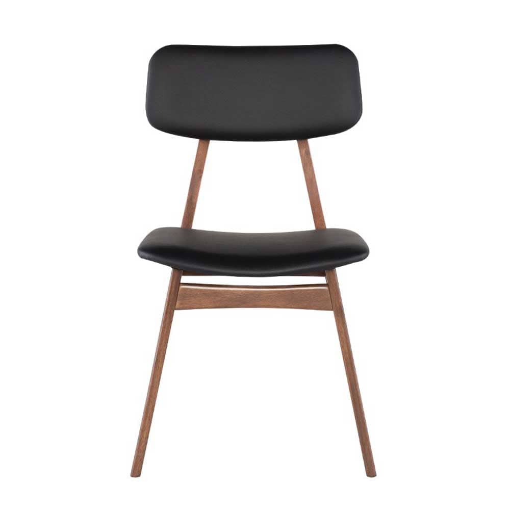 The walnut-stained rubberwood frame adds a touch of warmth and sophistication to the Scott chair. Its structured and elegant design provides a subtle contrast with the black naugahyde upholstery, creating a harmonious balance between modernity and tradition.