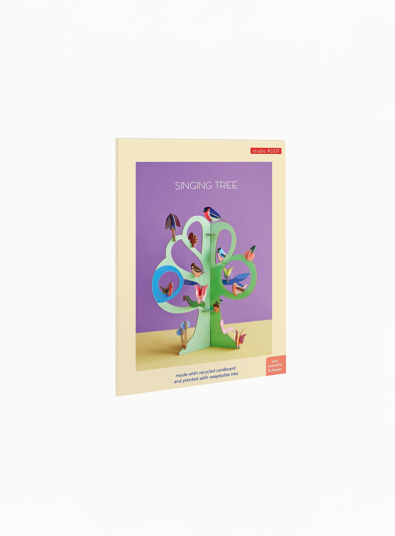Made from recycled cardboard and printed with vegetable-based inks, the Singing Tree is part of Studio Roof's eco-friendly philosophy: to offer objects that are durable, aesthetically pleasing, and respectful of the planet. Delivered flat, it assembles easily to reveal a vibrant and expressive three-dimensional creation, perfect for displaying on a table, shelf, or in a creative corner.