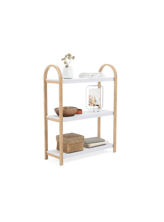 The Umbra Bellwood Freestanding Shelf combines sleek design and functionality to provide a modern, versatile storage solution. Its refined aesthetic, featuring real wood accents and clean lines, allows it to blend seamlessly into a variety of spaces while showcasing your decorative items, books, plants, or everyday accessories.