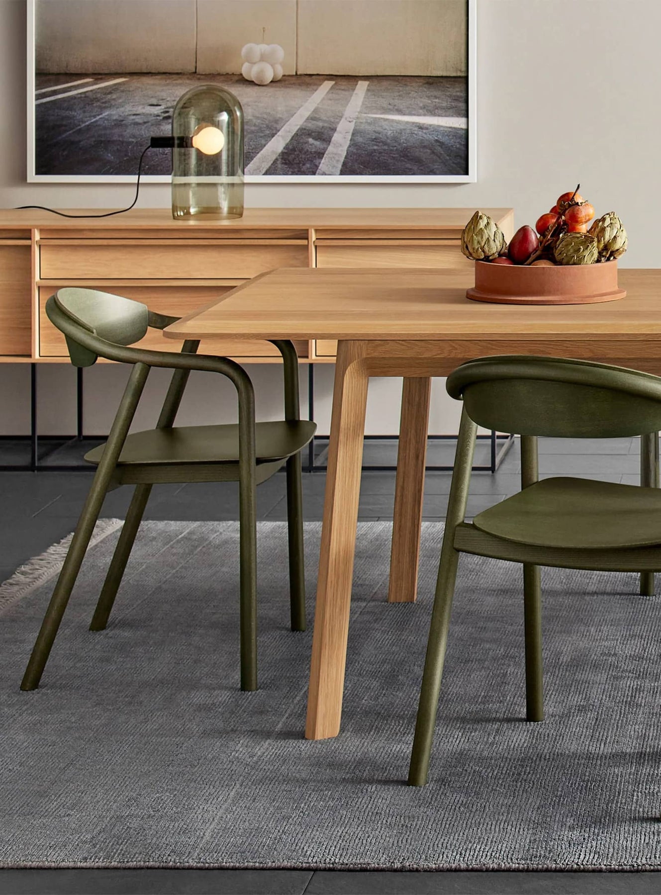 Dans un environnement, la Dibs s’exprime pleinement : autour d’une table en bois clair, elle crée un contraste élégant, que ce soit dans une teinte noire profonde ou dans un vert doux. Sa polyvalence permet de l’intégrer aussi bien dans un intérieur minimaliste que dans un décor chaleureux et éclectique. Que vous la choisissiez en couleur sobre ou en tonalité plus originale, elle devient un élément central qui attire l’œil sans jamais dominer l’espace.