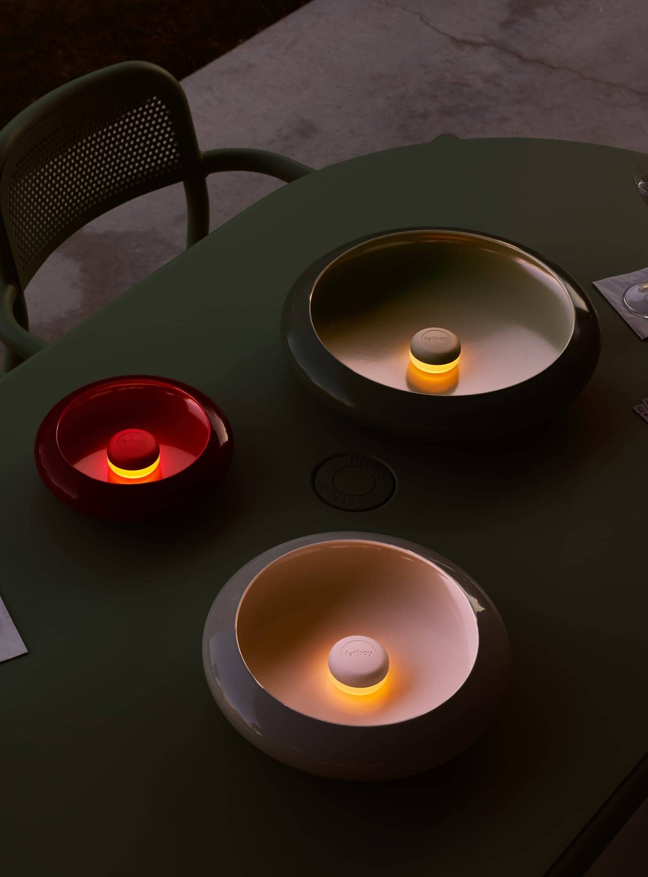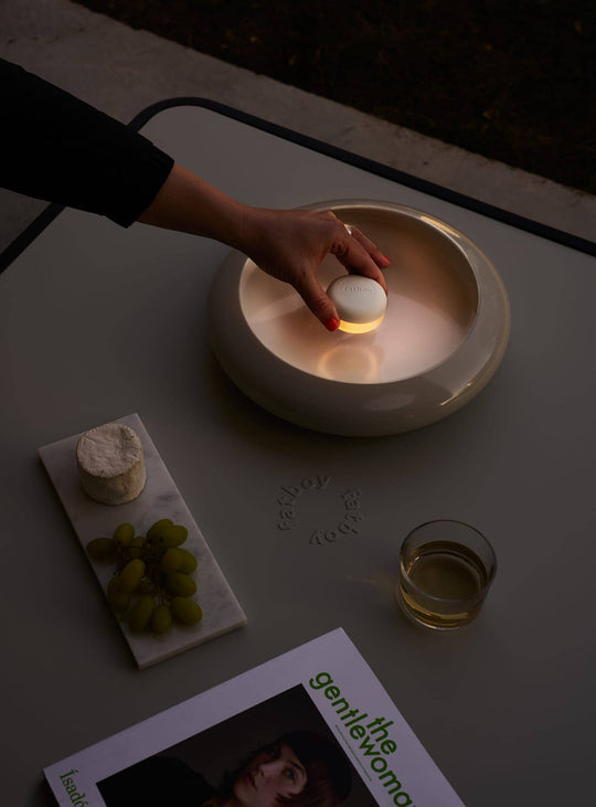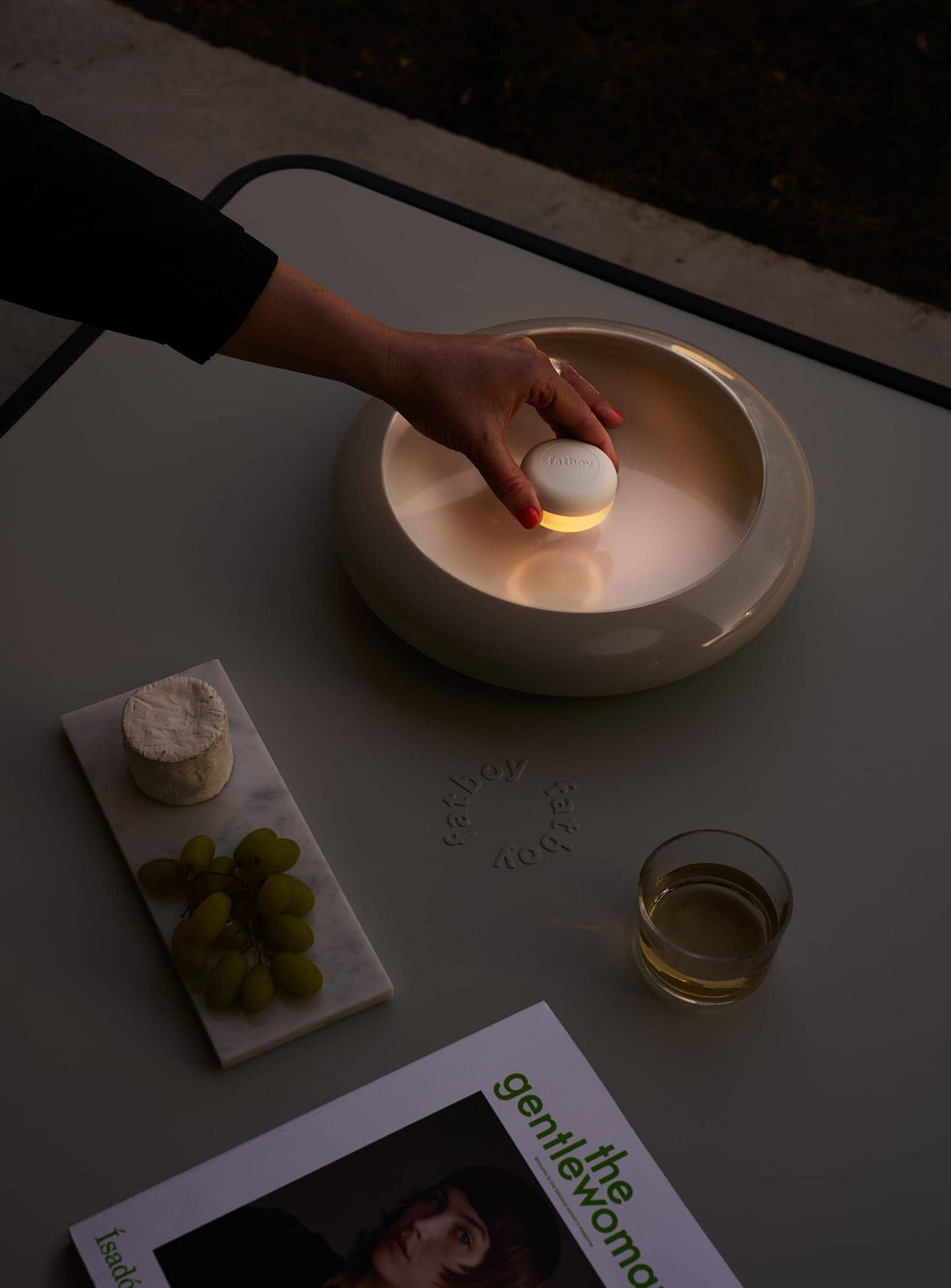 Oloha de Fatboy : un éclairage artistique avec un bol métallique élégant et une lumière LED rechargeable.
