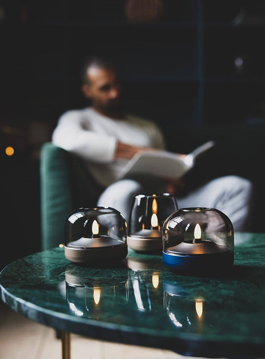 Bougie LED Glow 08 : élégance danoise et durabilité réunies dans une solution d’éclairage rechargeable et écologique. Bleu lunaire