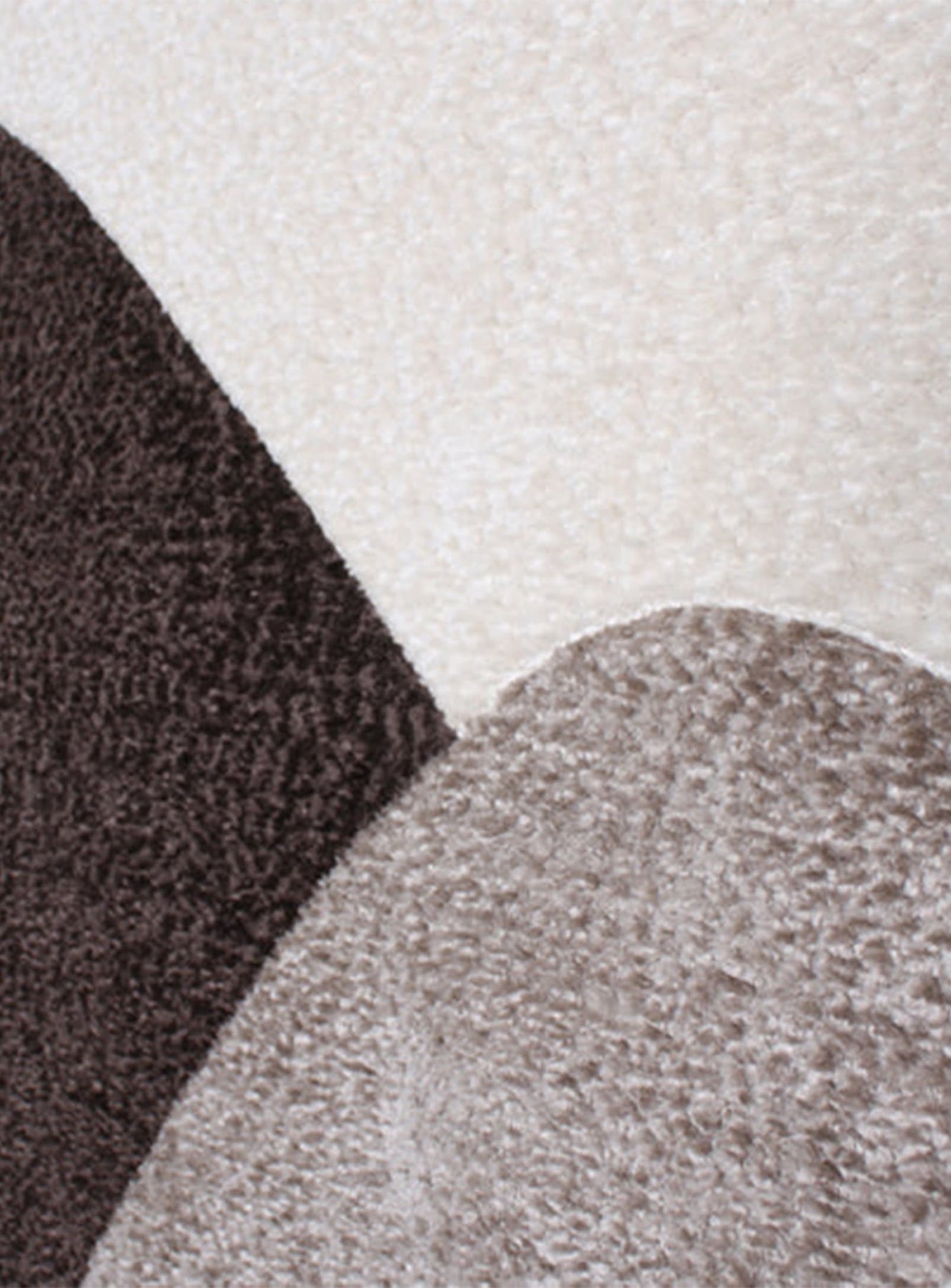 La matière joue un rôle clé dans l’impression de douceur. Réalisées en tissu Sherpa, ces surfaces offrent un toucher velouté et une texture riche qui accrochent subtilement la lumière. Les découpes sont soigneusement assemblées à la main, créant des transitions nettes et un léger relief qui donne de la profondeur au paysage abstrait.