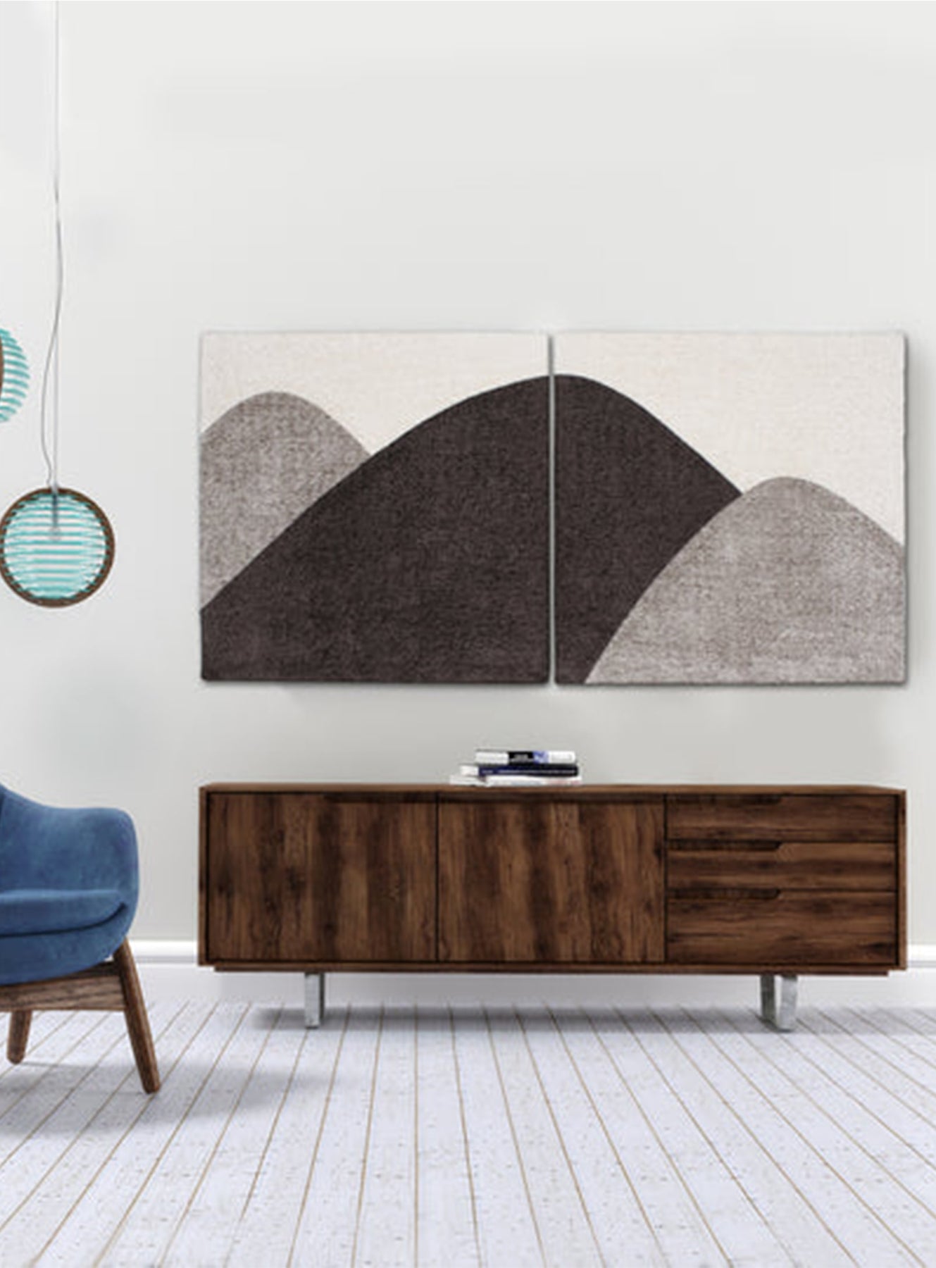 Les toiles murales Alpin de Marie Dooley forment un diptyque apaisant composé de deux tableaux carrés dans une palette de bruns, taupe et crème. Les courbes superposées suggèrent des sommets et des vallées, comme un horizon de montagne simplifié. Chaque panneau peut se suffire à lui-même, mais l’ensemble révèle toute sa force lorsqu’ils sont placés côte à côte. On peut même inverser l’ordre des panneaux pour ajuster la ligne d’horizon selon l’espace.
