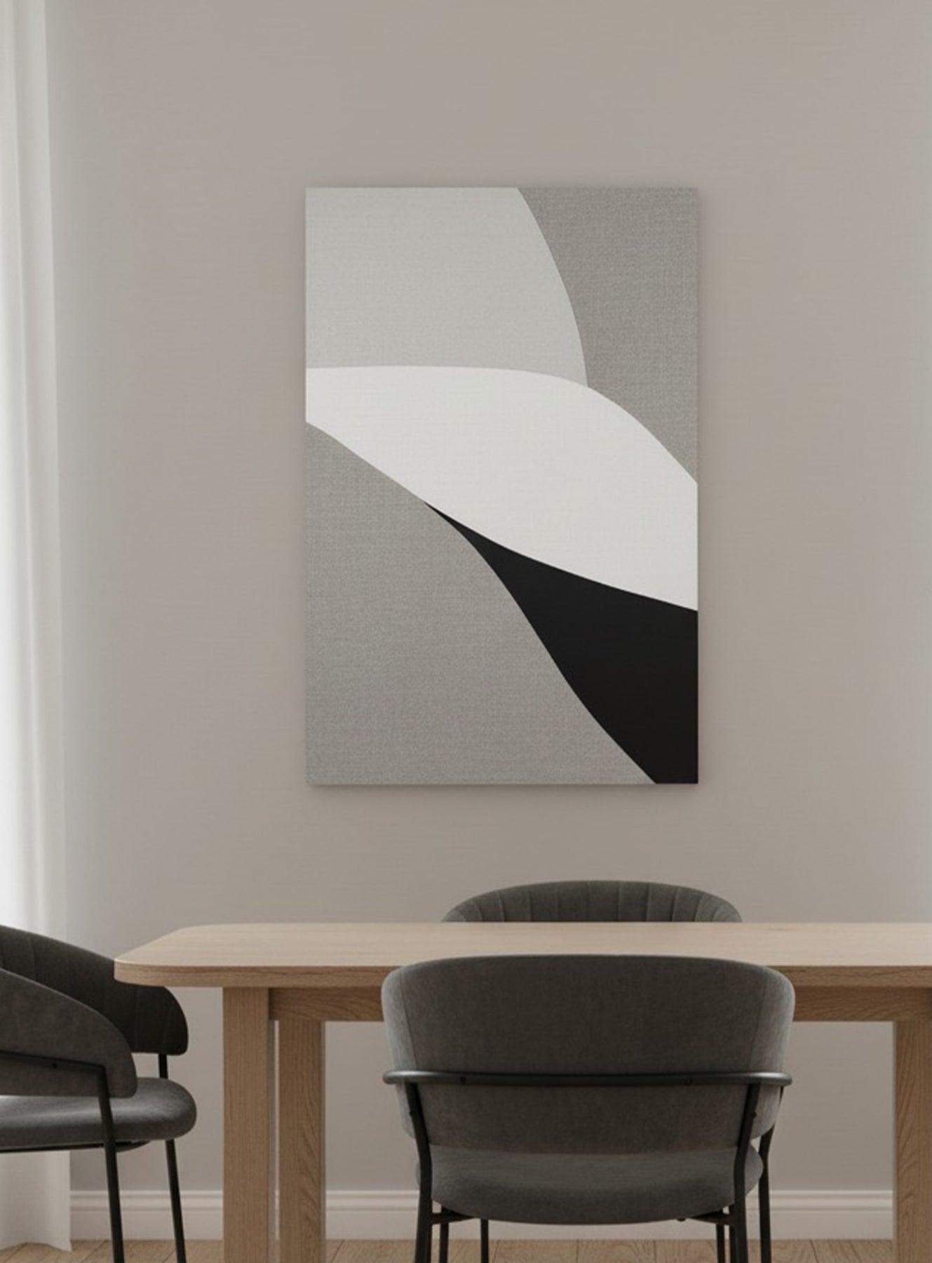 Le tableau Esprit de Marie Dooley se distingue par son esthétique sobre et raffinée, jouant avec des formes géométriques épurées dans une palette de beige, de gris et de noir. Cette composition minimaliste évoque l’équilibre et la fluidité à travers des courbes superposées, qui dialoguent subtilement entre ombre et lumière.