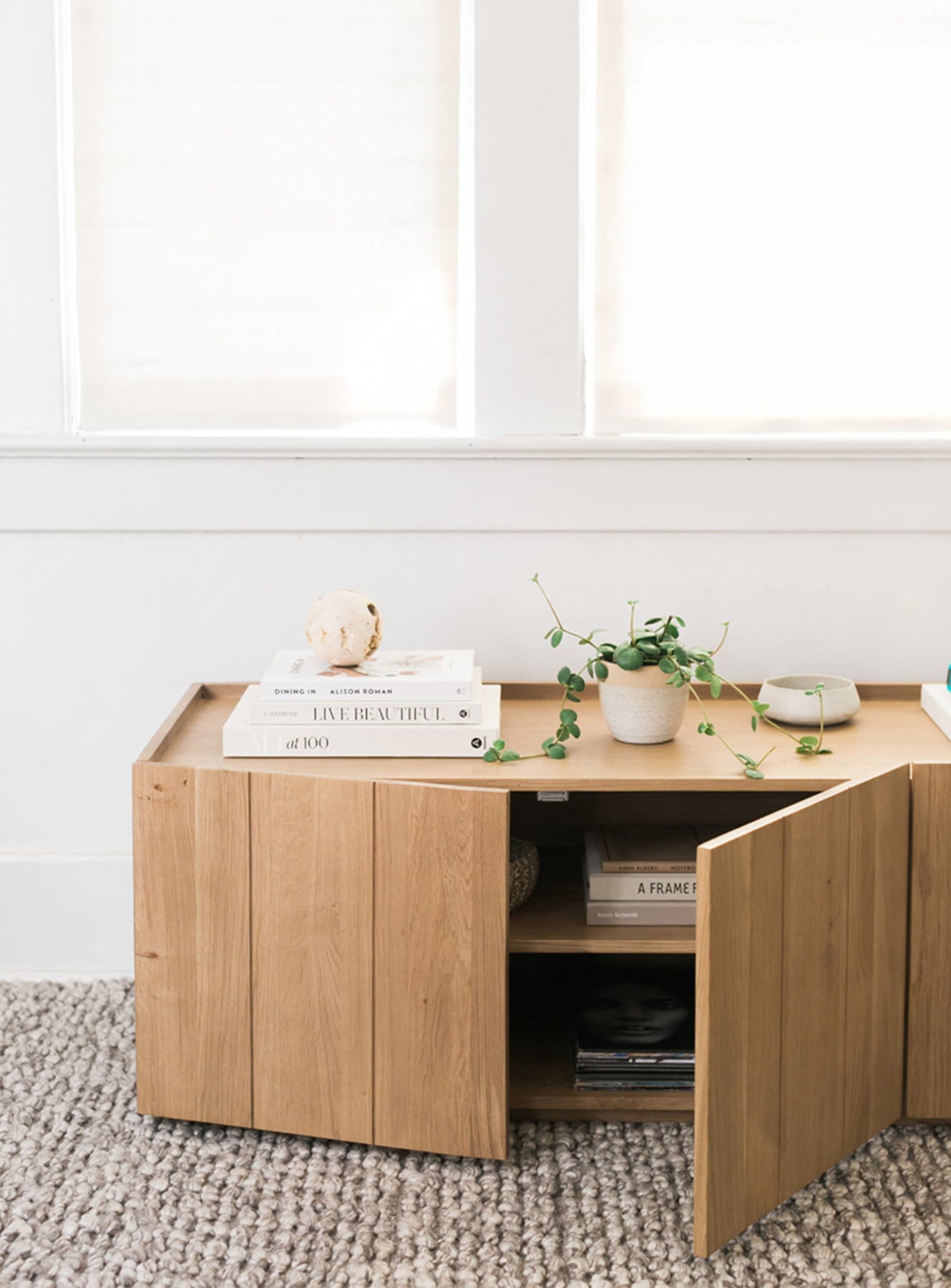 Les deux portes de placard du meuble TV Plank sont équipées d'une fermeture magnétique, garantissant un accès facile et une fermeture sécurisée. Les portes pivotent pour révéler des étagères généreuses et polyvalentes, offrant ainsi un espace de rangement flexible pour vos appareils électroniques, vos médias ou d'autres objets essentiels.