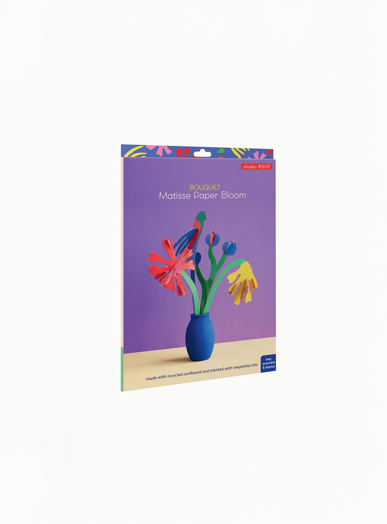 Fidèle à la démarche écoresponsable de Studio Roof, le Matisse Paper Bloom est fabriqué à partir de carton recyclé et imprimé avec des encres végétales, un choix qui allie esthétique et durabilité. Livré à plat, il se monte en quelques gestes pour se métamorphoser en un bouquet 3D élégant et intemporel — un objet à la fois poétique, décoratif et porteur de sens.