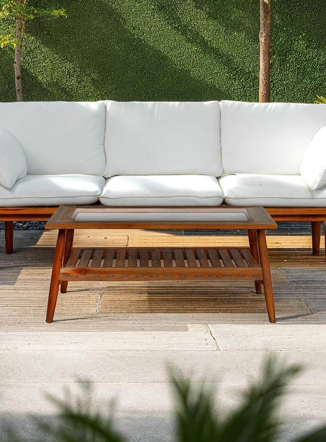 Fabriquée avec soin à partir d'un mélange harmonieux de bois de teck massif et de verre trempé, cette table à café rectangulaire redéfinit la polyvalence dans n'importe quel environnement. Le bois de teck massif apporte une touche de chaleur et d'authenticité, tandis que le verre trempé ajoute une touche de modernité et de sophistication, créant ainsi un contraste visuel saisissant.