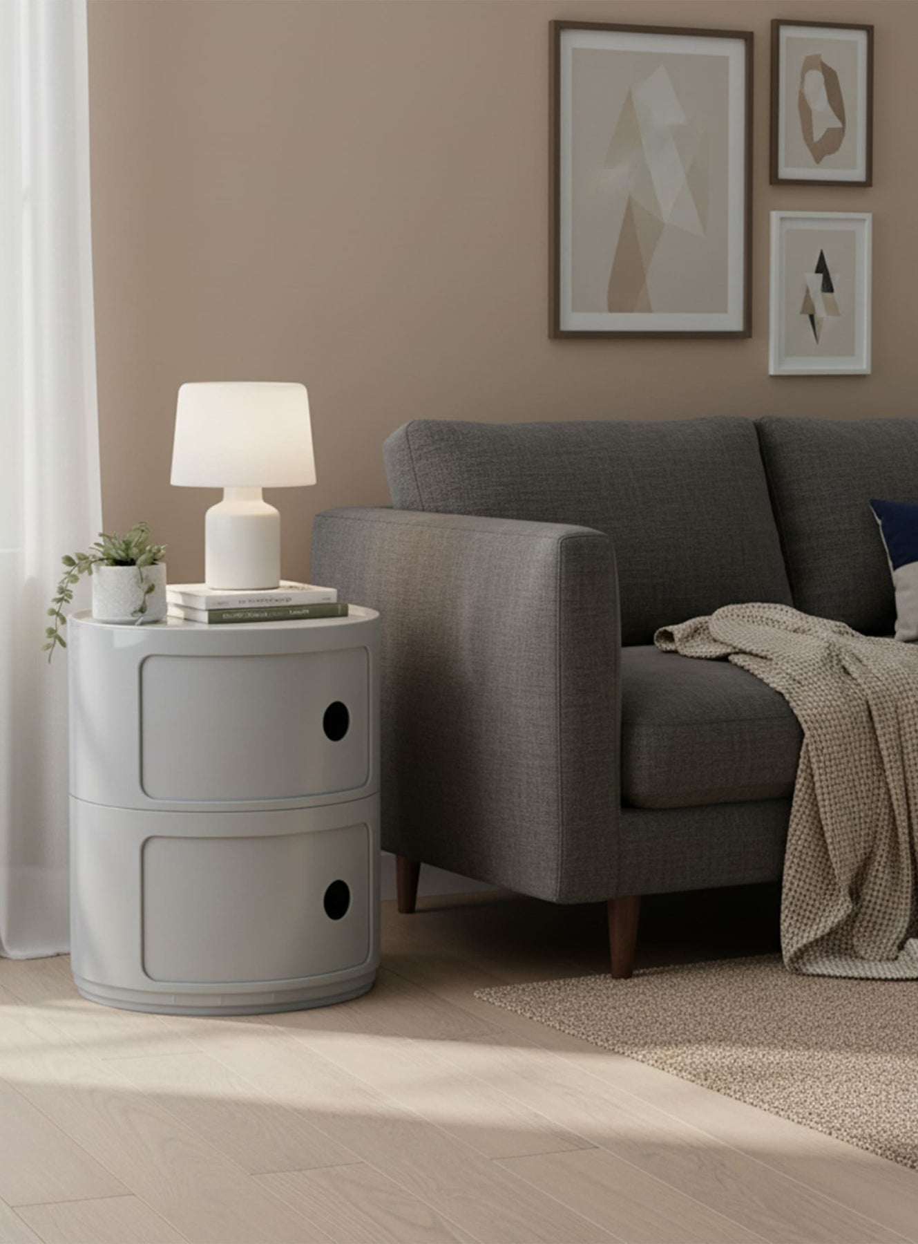 La table d’appoint Moderno est un meuble polyvalent et ingénieux, parfait pour divers usages domestiques et professionnels. D'une hauteur de 12.6" / 40 cm et d'un diamètre de 15.7" / 32 cm, elle se distingue par ses deux espaces de rangement équipés de portes coulissantes. Ce design astucieux permet une ouverture facile, facilitant ainsi l'accès aux objets rangés à l'intérieur. Grâce à cette fonctionnalité, la Moderno se révèle être le partenaire idéal pour initier les plus petits au rangement de leurs chambres, rendant cette tâche ludique et accessible.