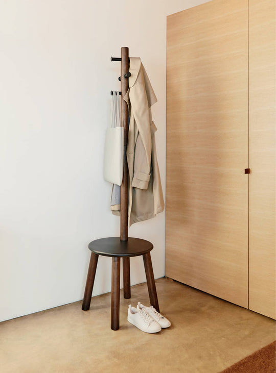 Doté de six crochets robustes, Pillar permet d’accrocher facilement vestes, manteaux, sacs, chapeaux ou serviettes. Son tabouret intégré ajoute une dimension supplémentaire : il peut servir de support pour des sacs ou des plantes, ou encore d’assise pratique pour enfiler ses chaussures avant de sortir. Compact et fonctionnel, il constitue une solution idéale pour les petits espaces en maximisant le rangement sans encombrer la pièce.
